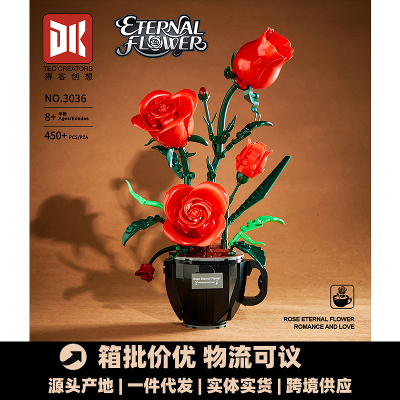 跨境植物花束玫瑰花兰花小颗粒积木拼装玩具摆件礼物女生玩具批发