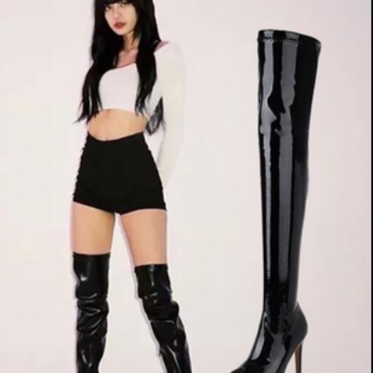 亮面粗跟高跟大腿靴漆皮过膝靴长筒夜店表演爵士舞超高跟钢管舞靴
