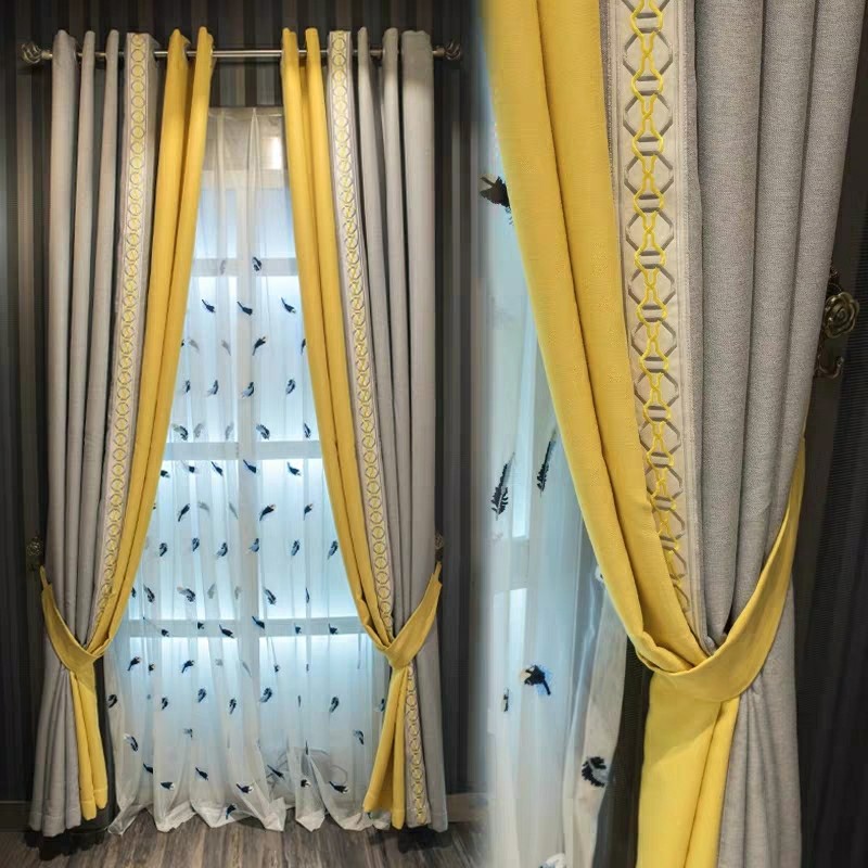 天鹅绒亚麻拼接遮光窗帘布料成品定制书房卧室落地窗北欧简约轻奢