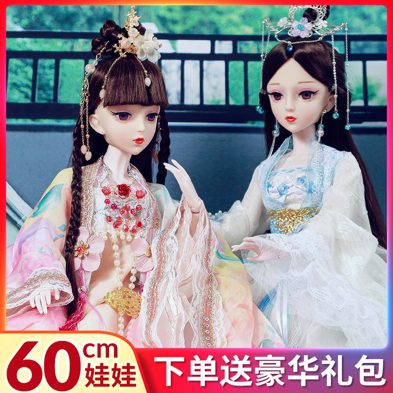 Boneka kostum kuno realistis 60cm lintas batas, mainan anak-anak Hanfu gaya kuno, set boneka putri perempuan.