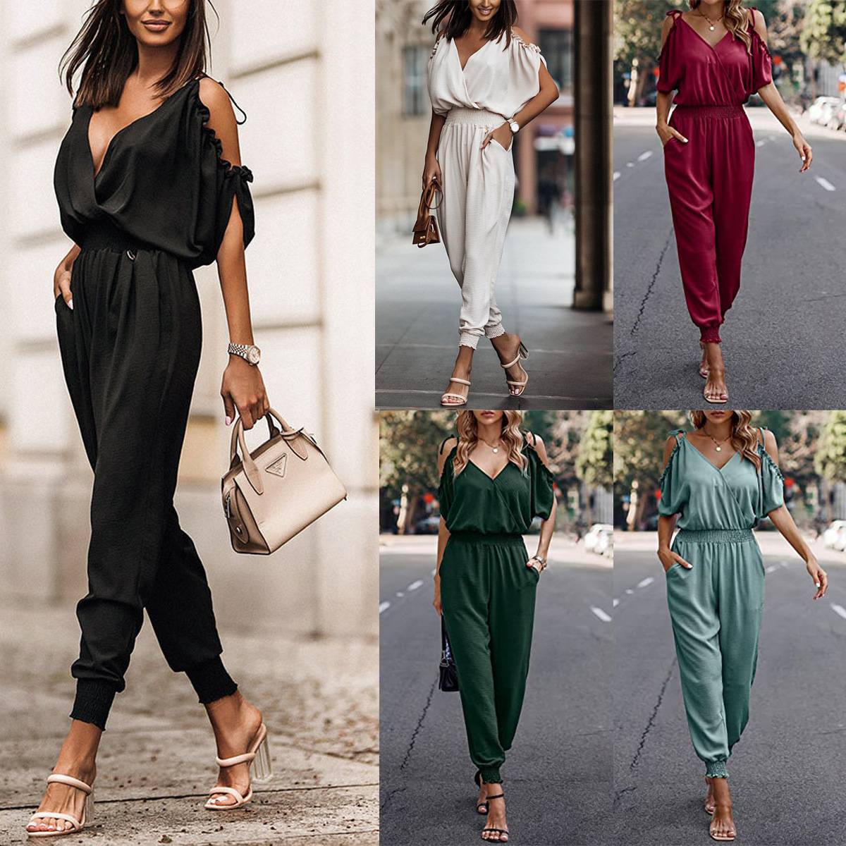 Stasiun independen lintas batas Amazon 2023 Eropa dan Amerika baru kerah V bahu terbuka kasual nyaman jumpsuit dasar