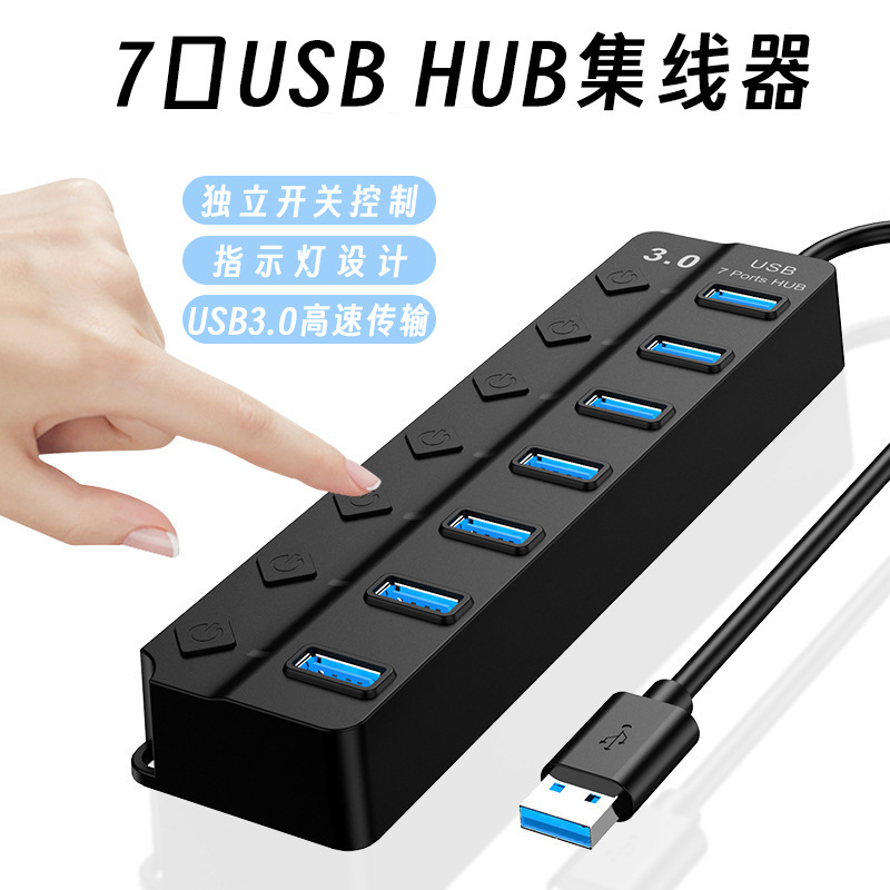 Ekspansi komputer hub hitam multifungsi USB3.0HUB tujuh port dengan sakelar independen multi-antarmuka tujuh-dalam-satu