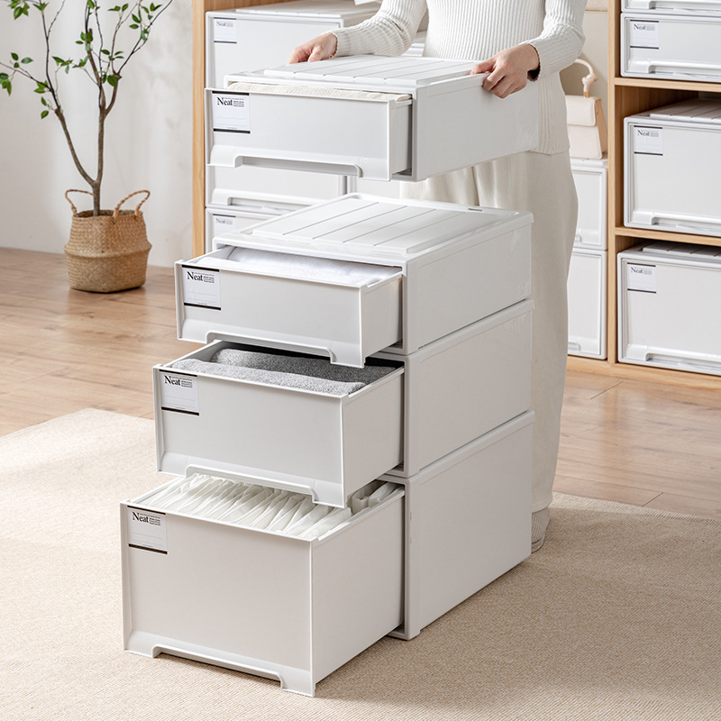 Alat ajaib penyimpanan pakaian, laci penyimpanan musiman plastik putih bersih, kotak penyimpanan model laci, kotak pengatur rumah untuk lemari pakaian.