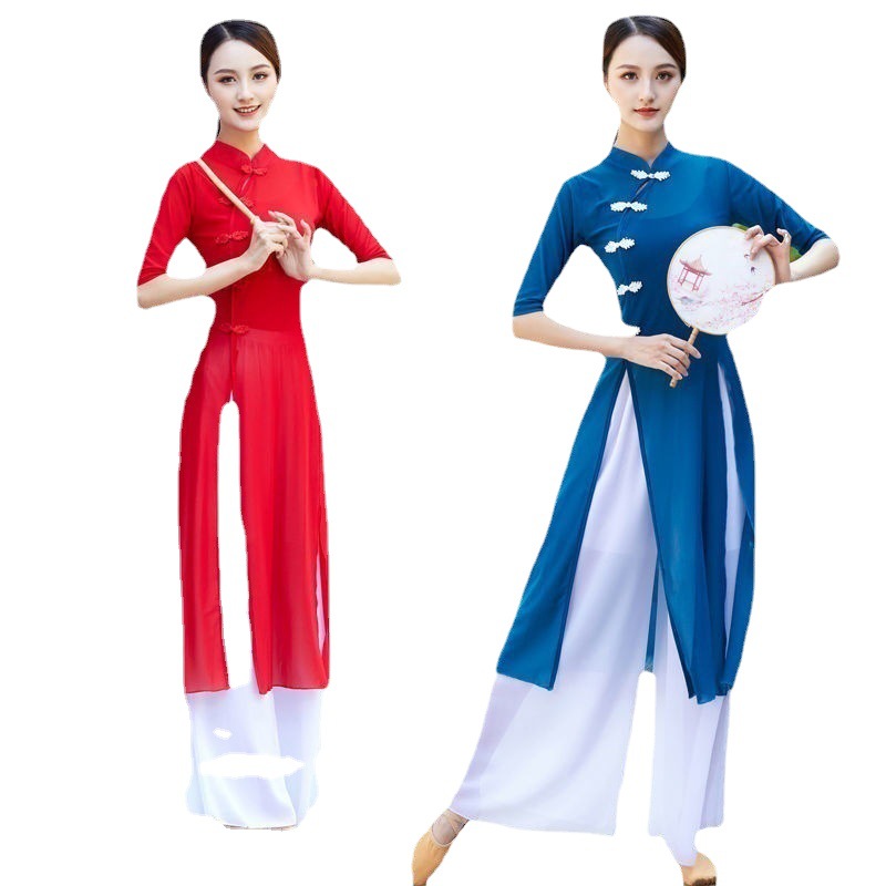 Pakaian pertunjukan wanita dewasa, pakaian latihan gaya etnik klasik, pakaian dansa musim semi dan musim panas, setelan pakaian kasa wanita