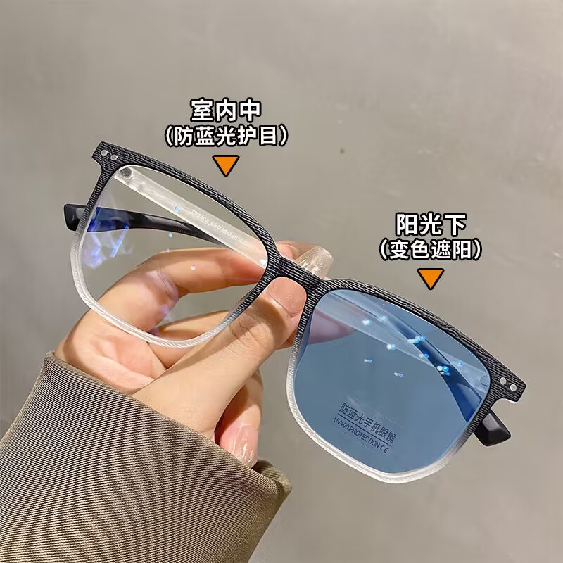 Kacamata fotokromik bingkai persegi kecil gaya pasangan trendi anti-cahaya biru dengan gagang motif kayu keren retro tanpa resep lensa fotokromik