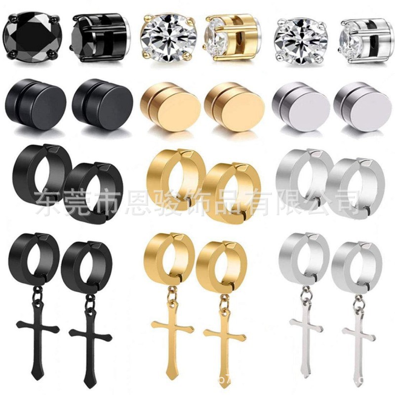 Setelan klip telinga Eropa dan Amerika, anting-anting liontin jepit baja tahan karat tidak menusuk magnetik 12 pasang