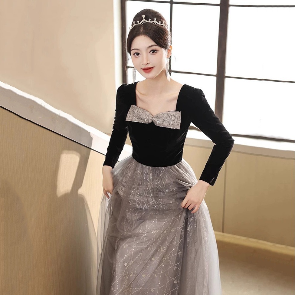 Gaun Malam Beludru Warna Hitam Gaun Terusan Wanita Lengan Panjang Ulang Tahun Elegan Modis Elegan Perjamuan Model Baru 2025