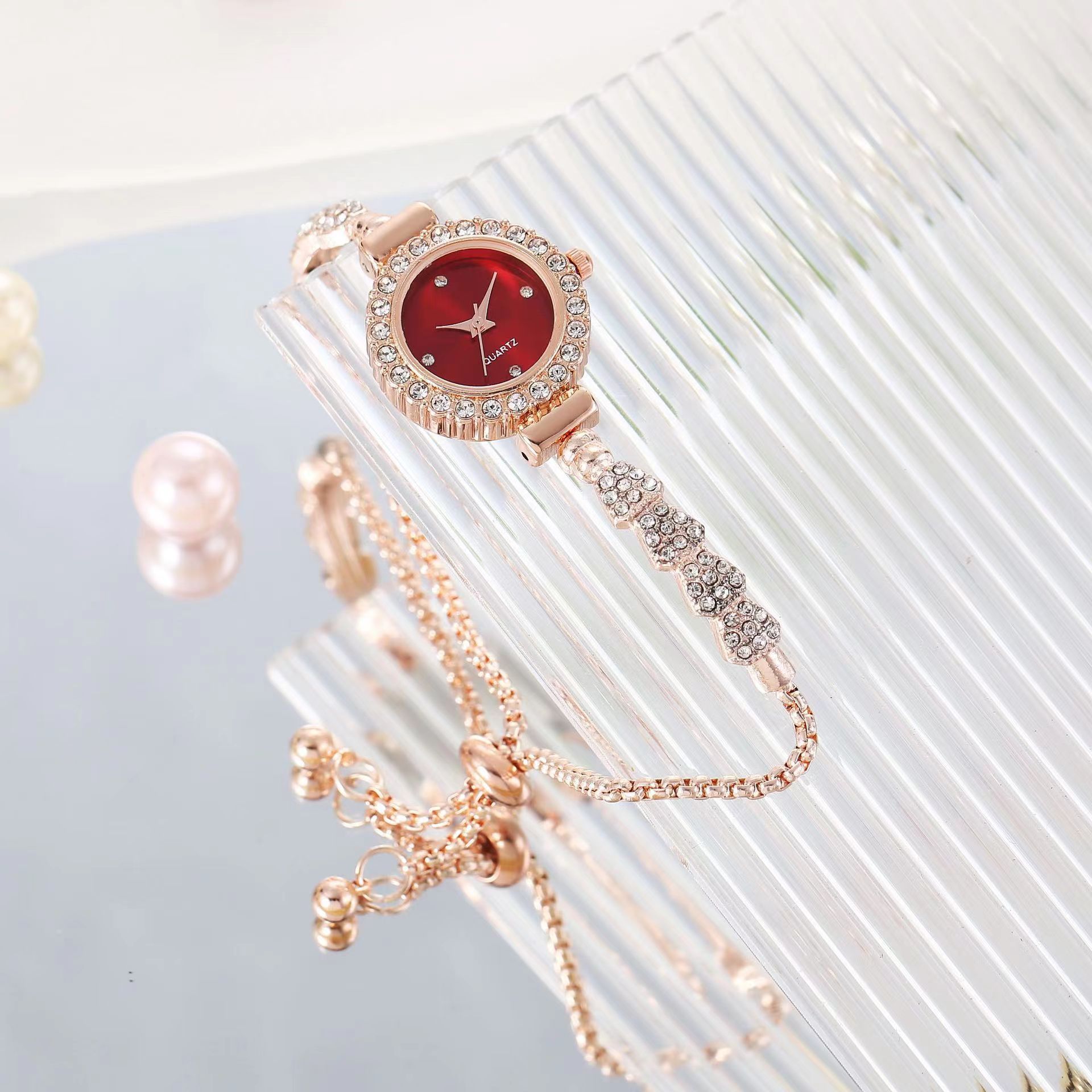 新款时尚镶钻圆形女士手表可调节手链表石英女表轻奢机械表电子表