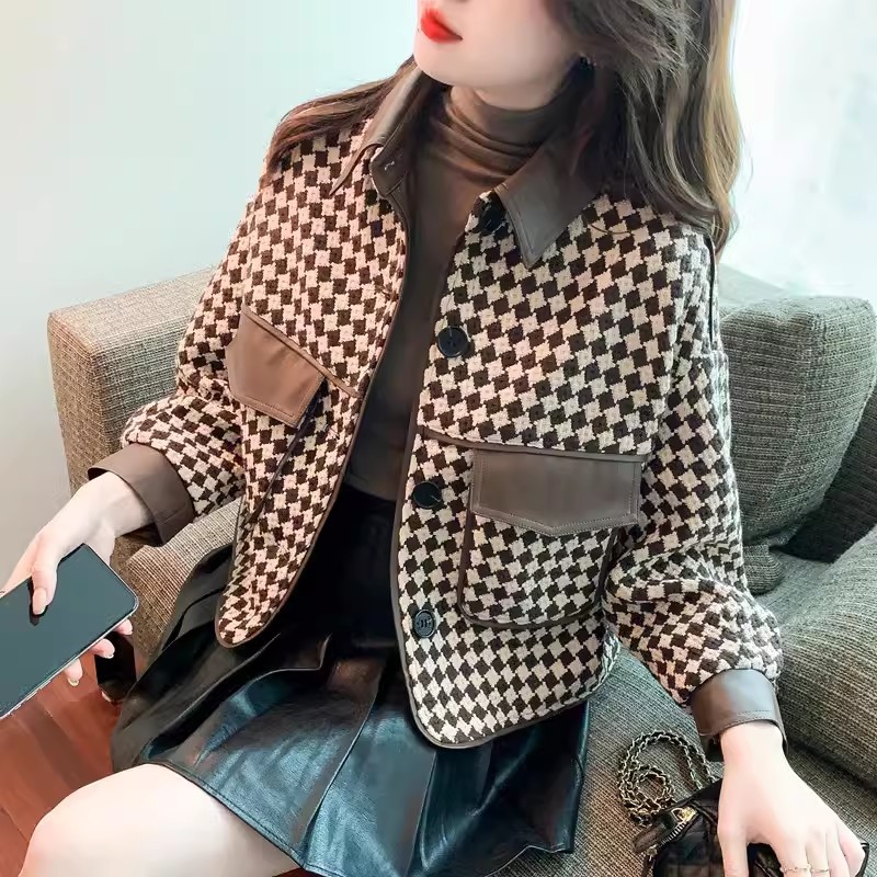 Jaket houndstooth modis untuk wanita, model pendek terinspirasi Chanel untuk musim semi, gugur, dan dingin 2025, cocok untuk tubuh berukuran kecil.