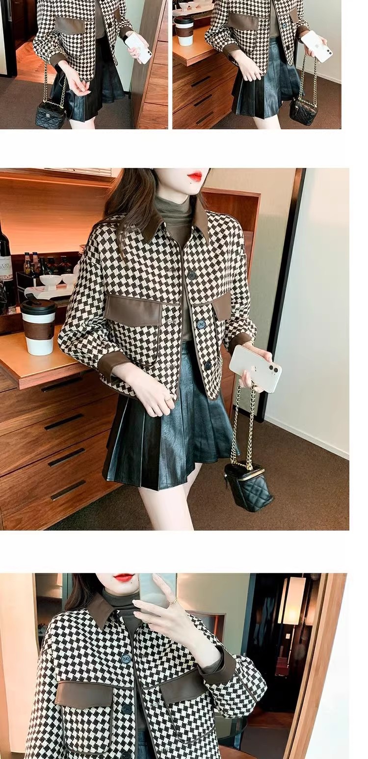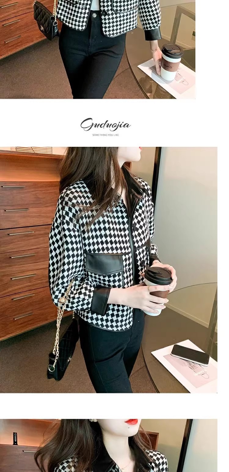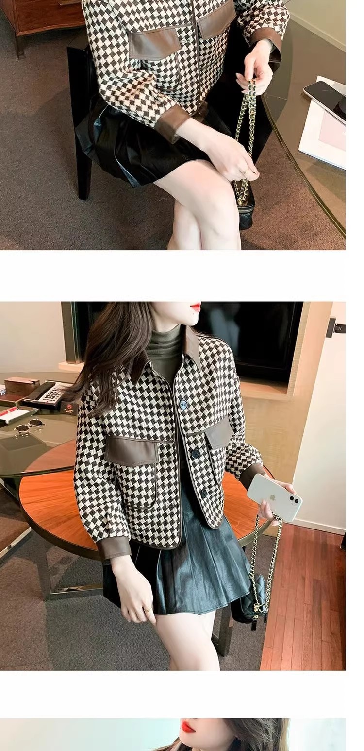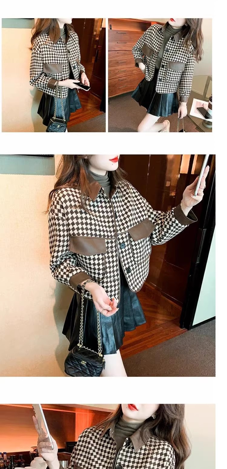 Jaket houndstooth modis untuk wanita, model pendek terinspirasi Chanel untuk musim semi, gugur, dan dingin 2025, cocok untuk tubuh berukuran kecil.