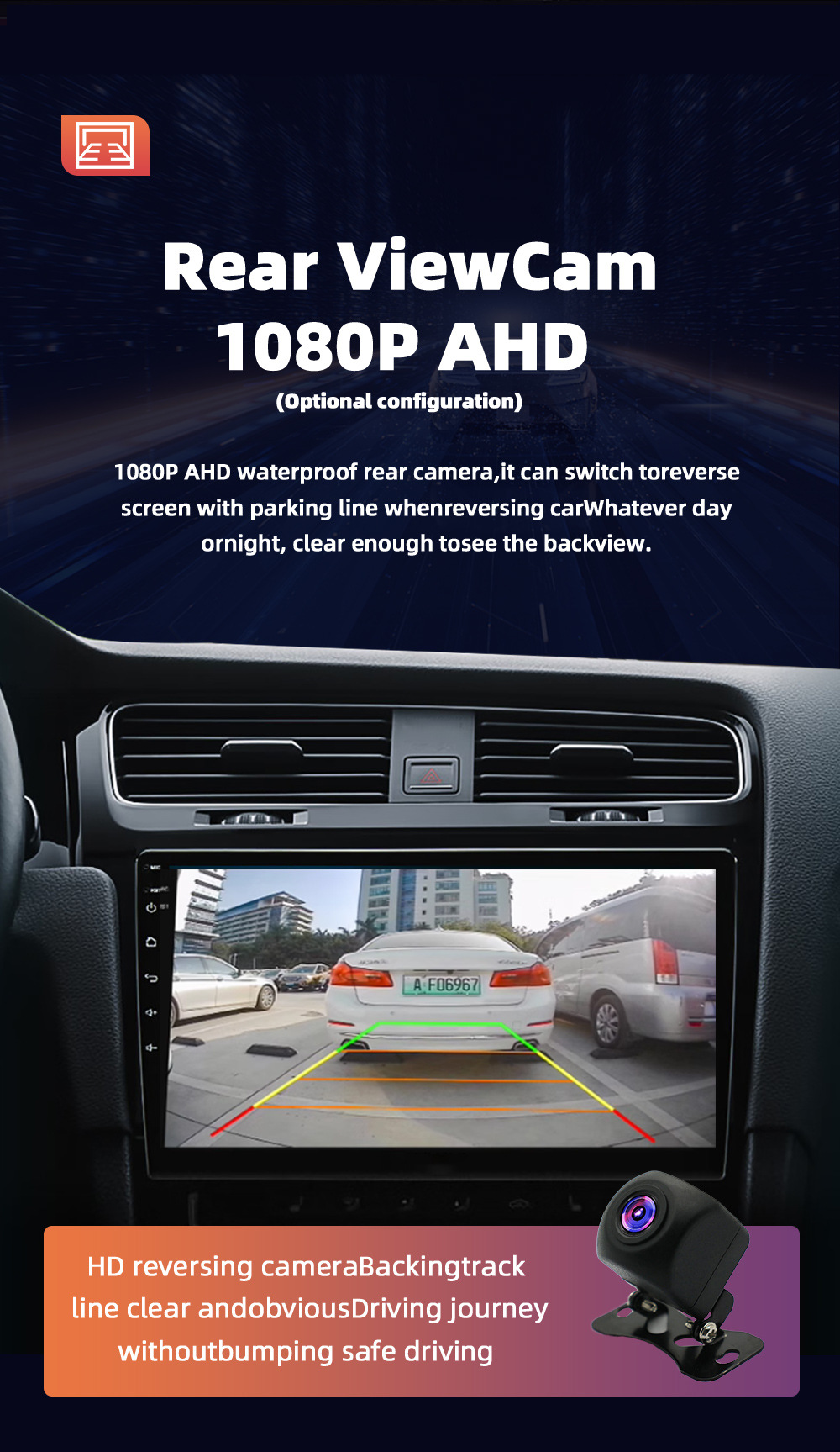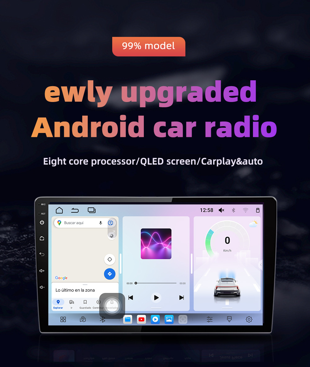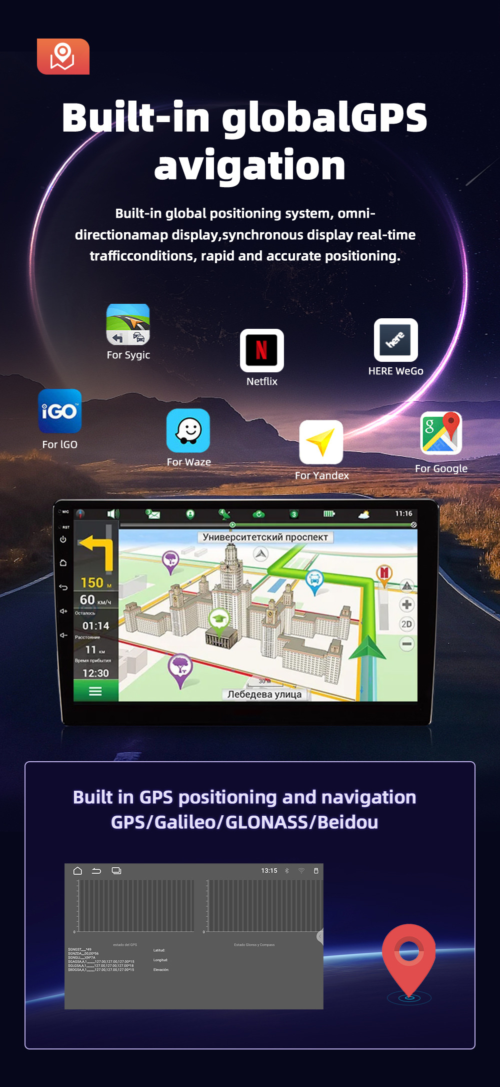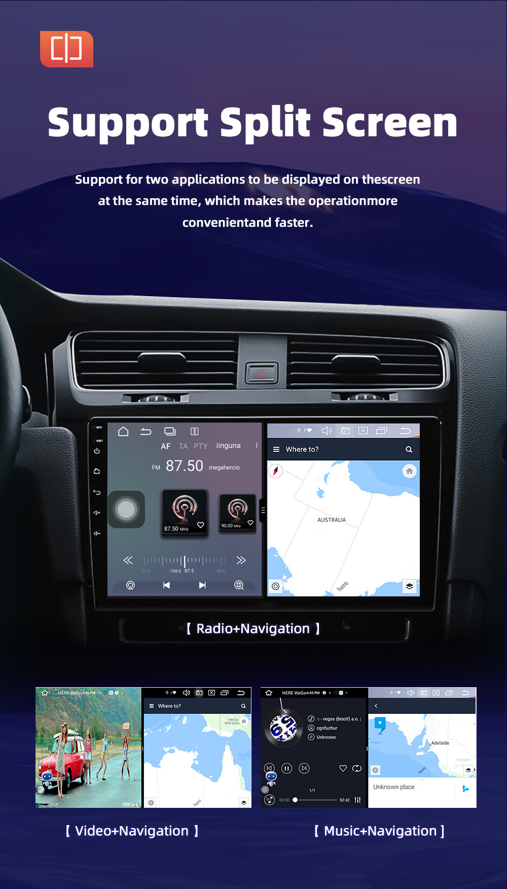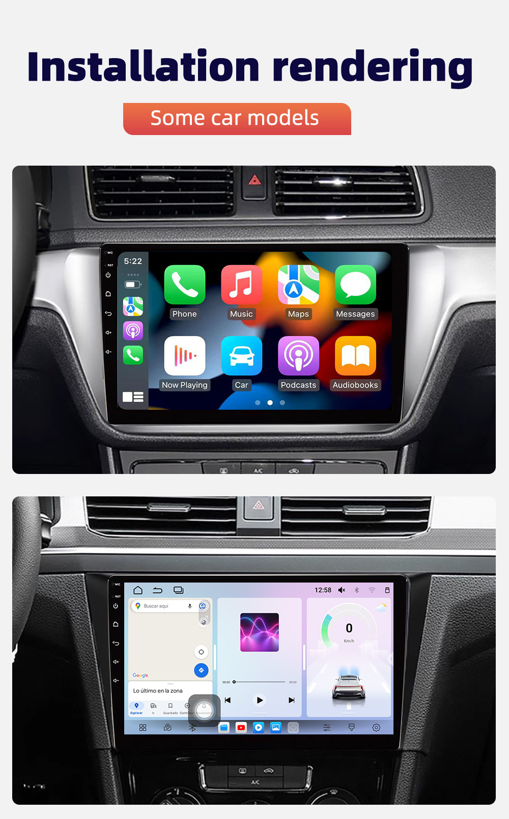 Sistem navigasi mobil layar besar 9-inci dan 10-inci lintas batas dengan konektivitas jaringan penuh, Bluetooth, CarPlay, dan kamera mundur terintegrasi.