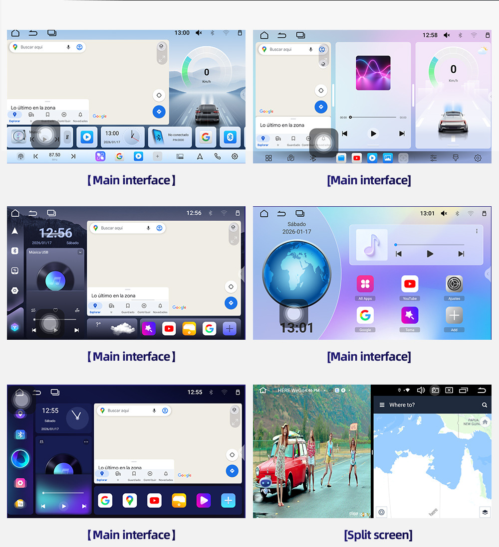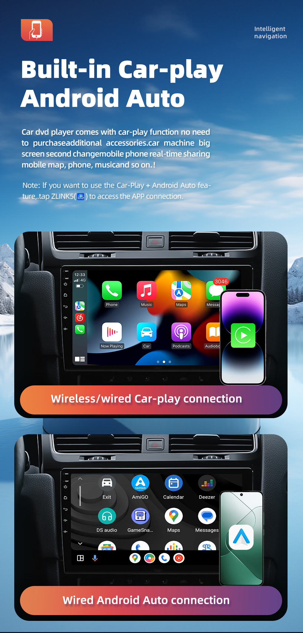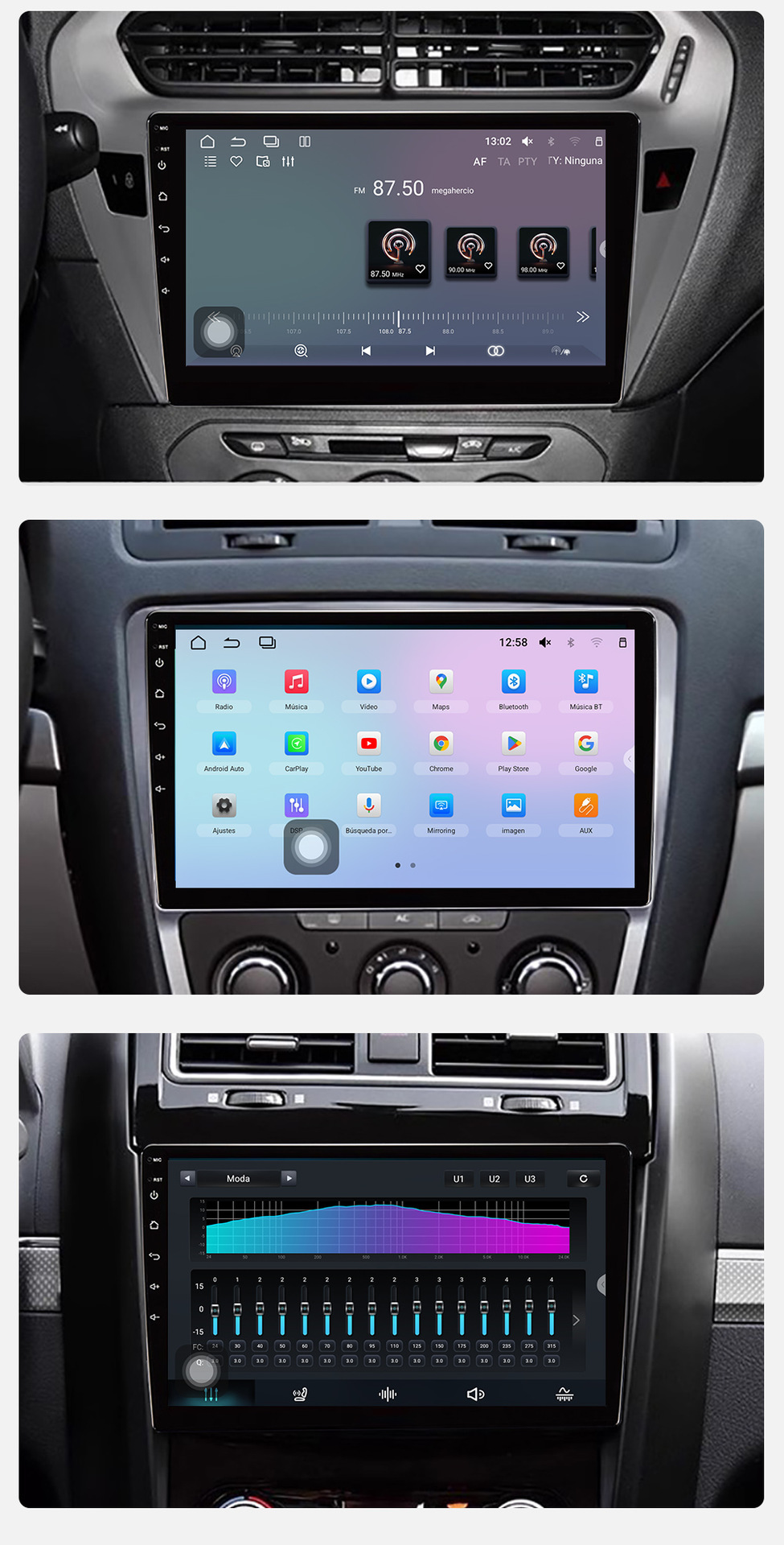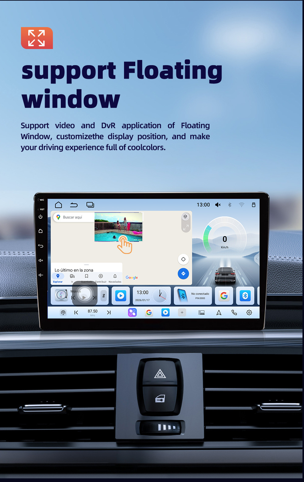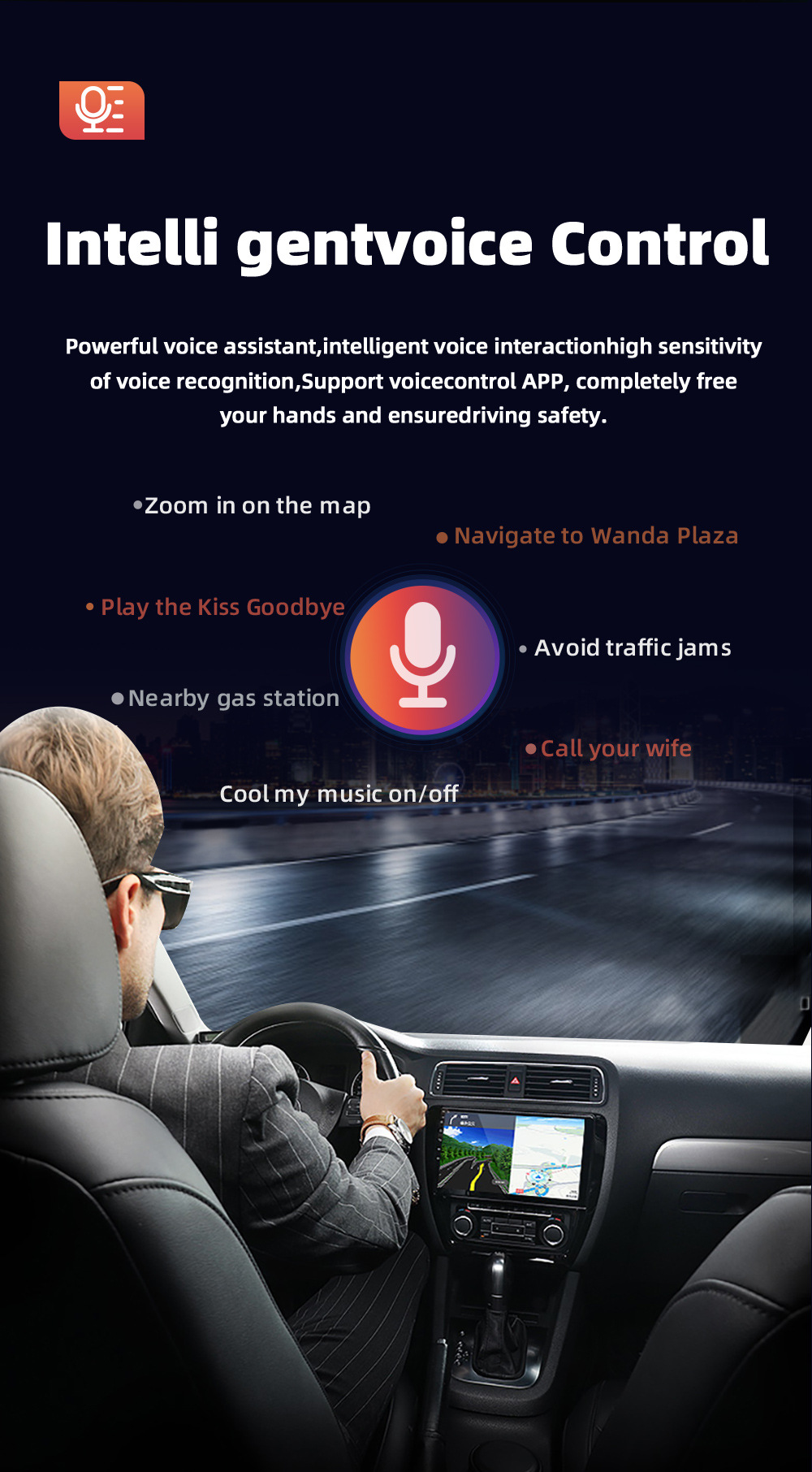 Sistem navigasi mobil layar besar 9-inci dan 10-inci lintas batas dengan konektivitas jaringan penuh, Bluetooth, CarPlay, dan kamera mundur terintegrasi.