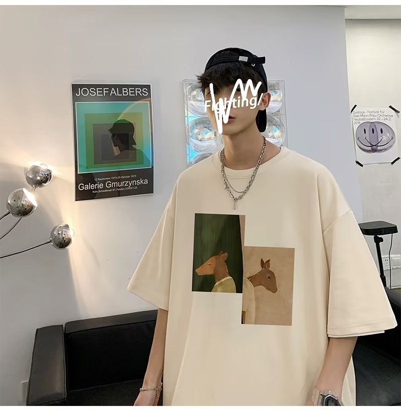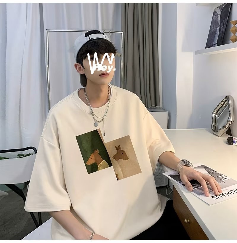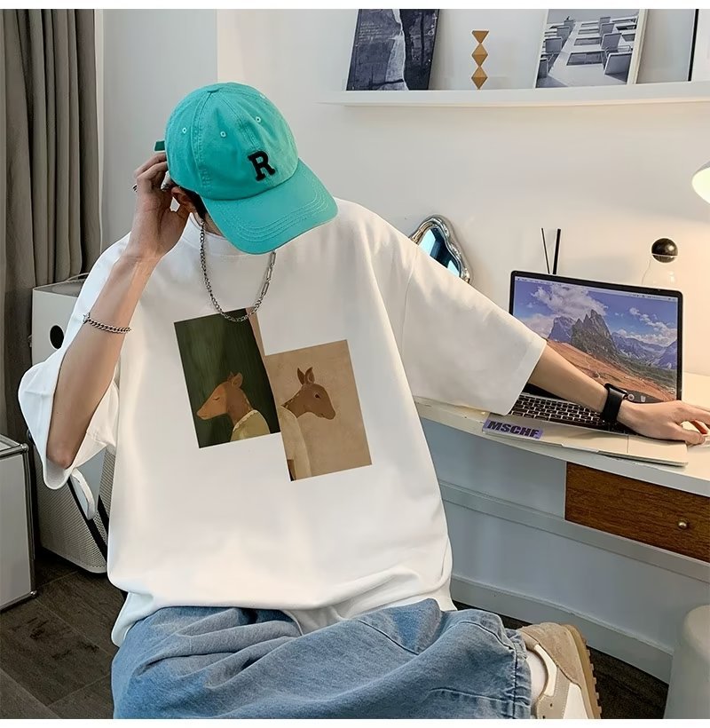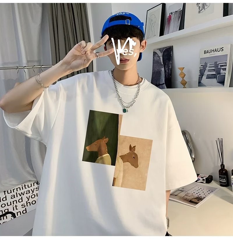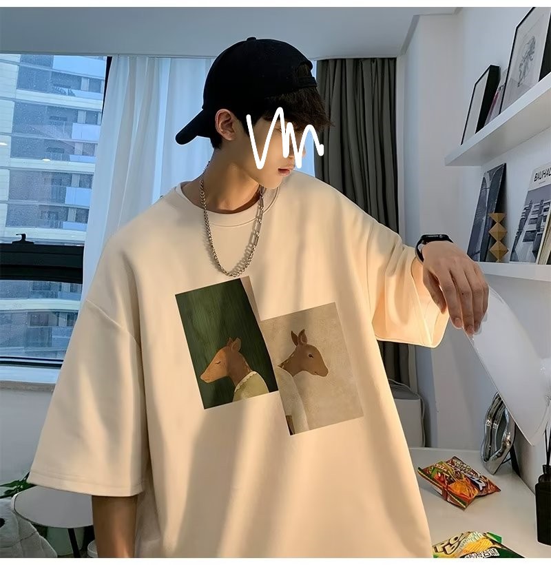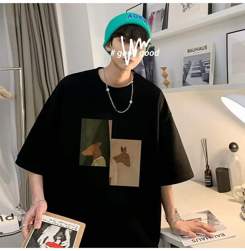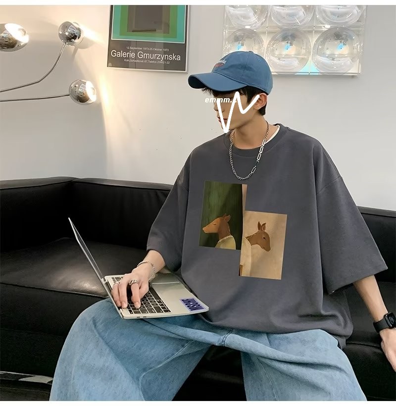 Kaus pria lengan pendek, kaus pria lengan pendek, mode longgar, kaus Amerika, retro, semua-cocok, atasan setengah lengan muda, musim panas