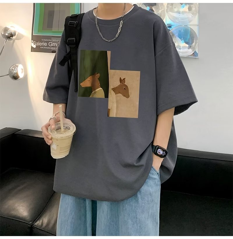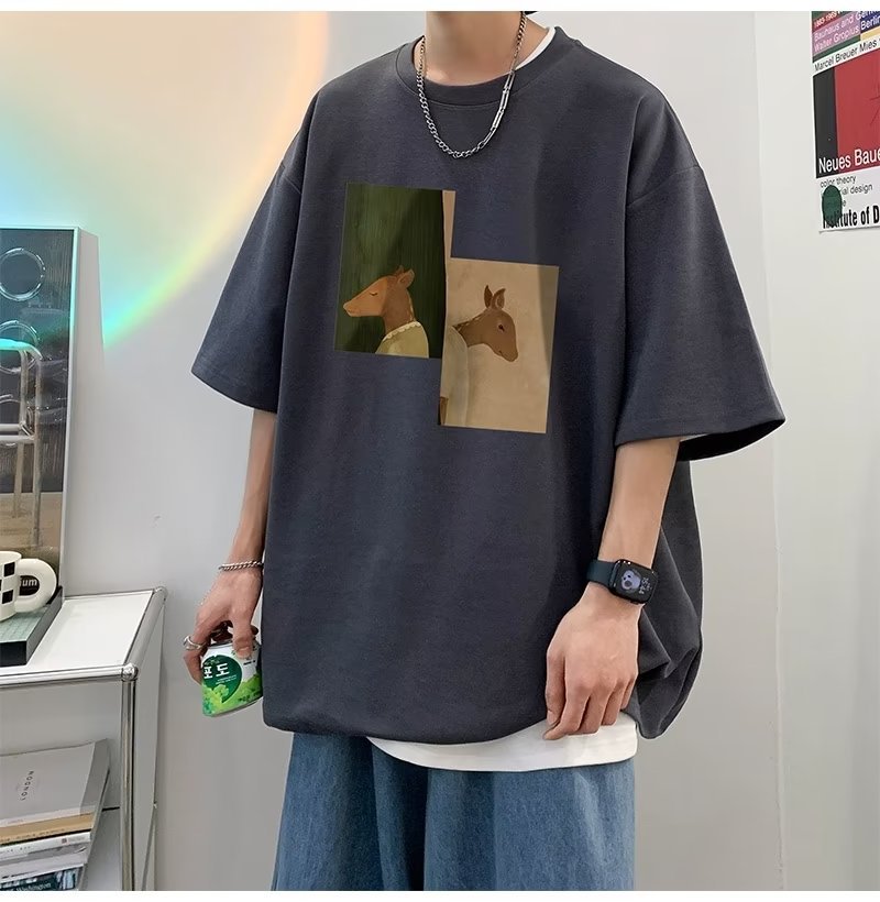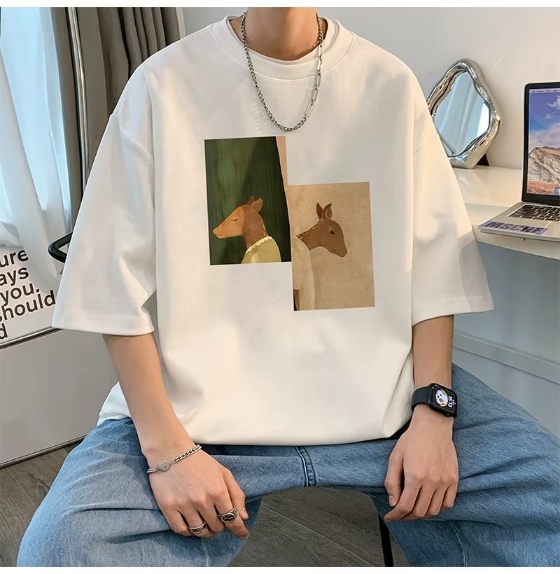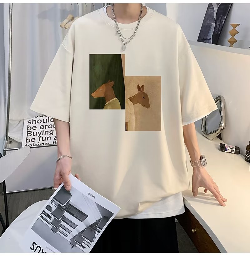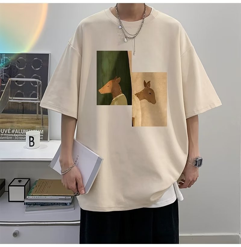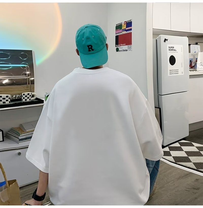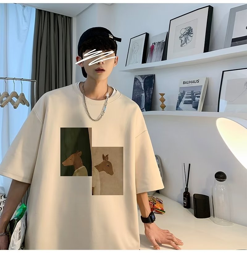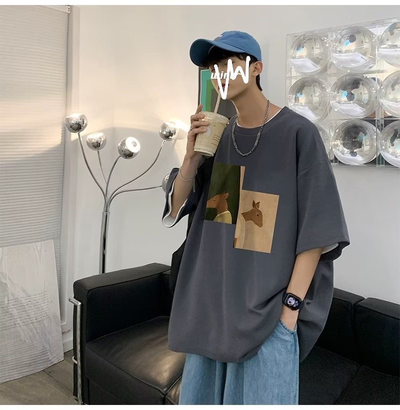 Kaus pria lengan pendek, kaus pria lengan pendek, mode longgar, kaus Amerika, retro, semua-cocok, atasan setengah lengan muda, musim panas
