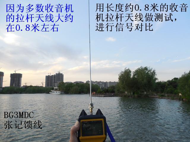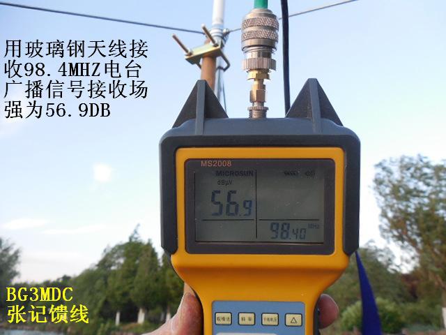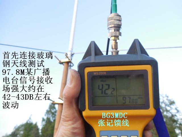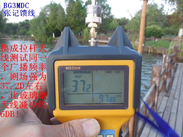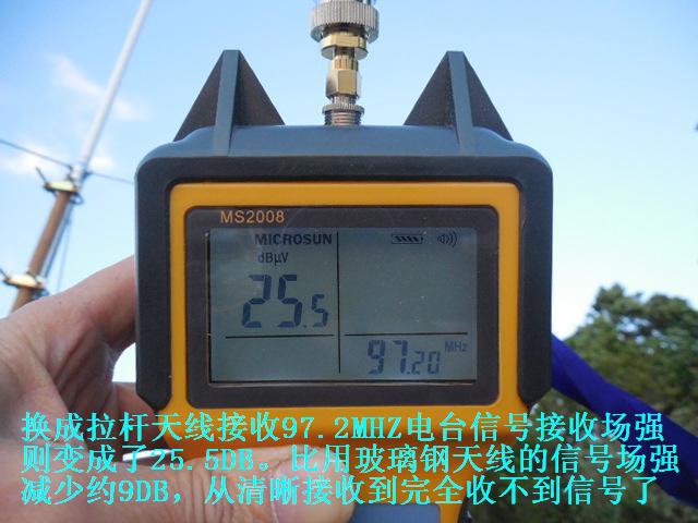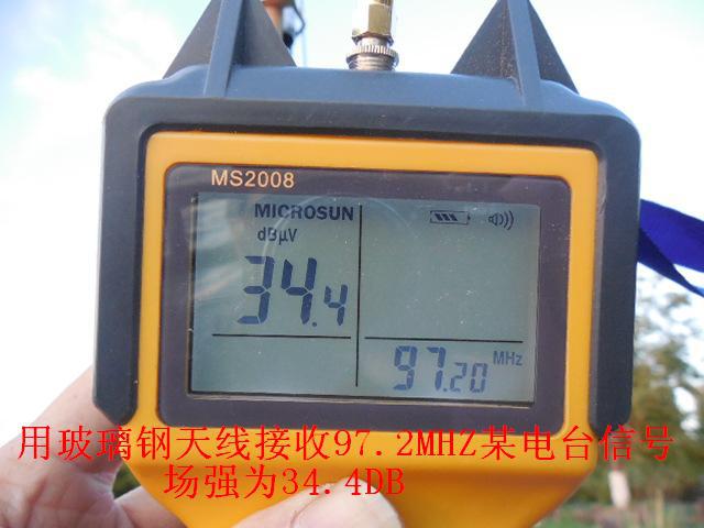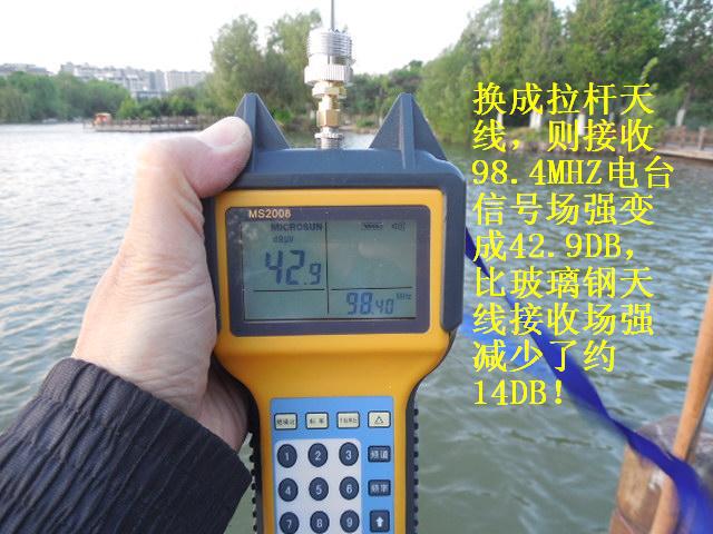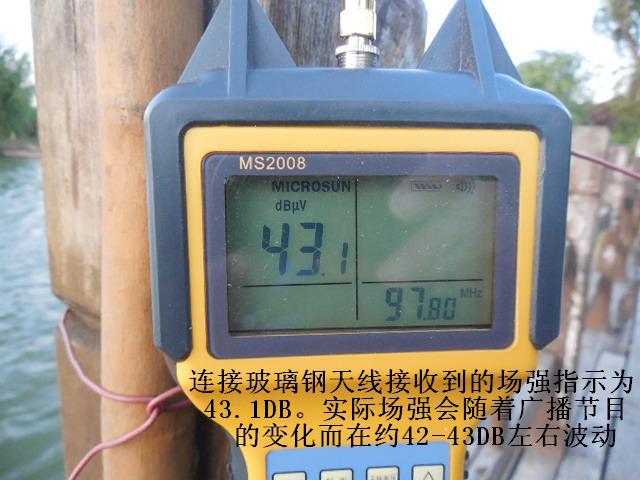 天线1.4米的增益约5DB,2.2米的增益约7DB左右,而普通收音机的拉杆天线,尺寸不到一米,增益为负数,约为-5至-8DB(普通长度为1.5米的1/2波长FM标准偶极天线的增益为0DB)因此,专业的天线接收能力要明显优于简易的拉杆天线和市面上爱好者自制的所谓FM天线。实际对比测试发现,用这两种天线作对比,信号区别非常显著,在同一位置拉杆天线完全收不到的远距离外地广播电台,接上玻璃钢天线后信号则立刻清晰稳定,可谓立竿见影。对于那些用拉杆天线接收有沙沙杂音的弱信号,换成玻璃钢天线后杂音消失了,立刻清晰了。另外,由于天线尺寸较长,在空中收集电波的能力也会显著提高,因此除了接收FM信号之外,对于短波广播电台信号的接收也大有帮助,可谓全能型接收广播天线。