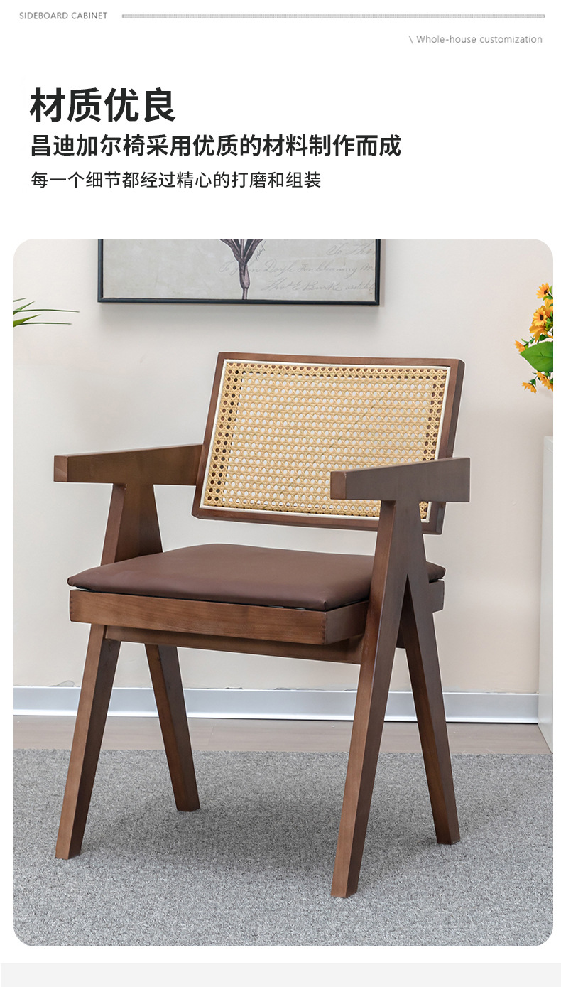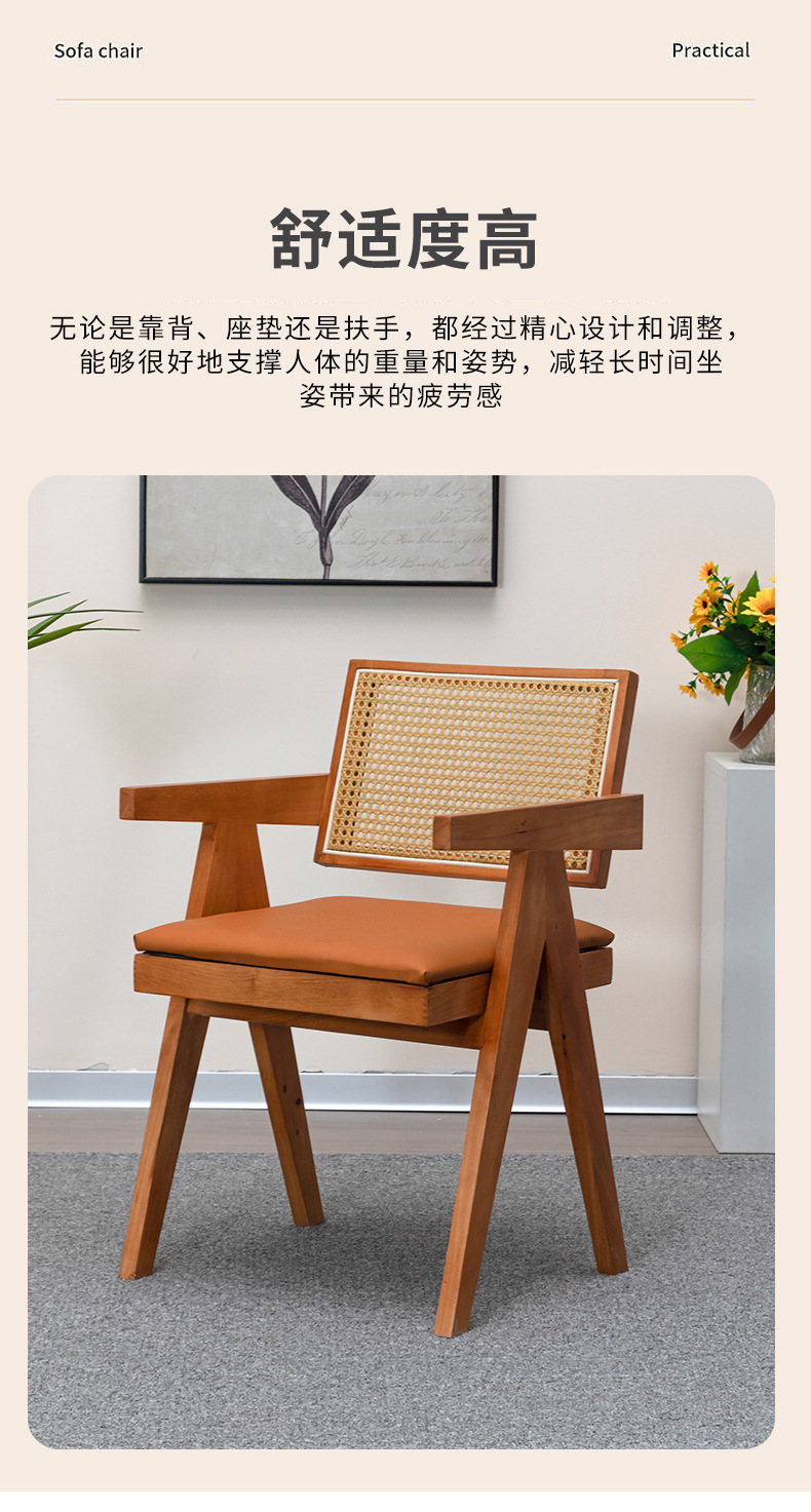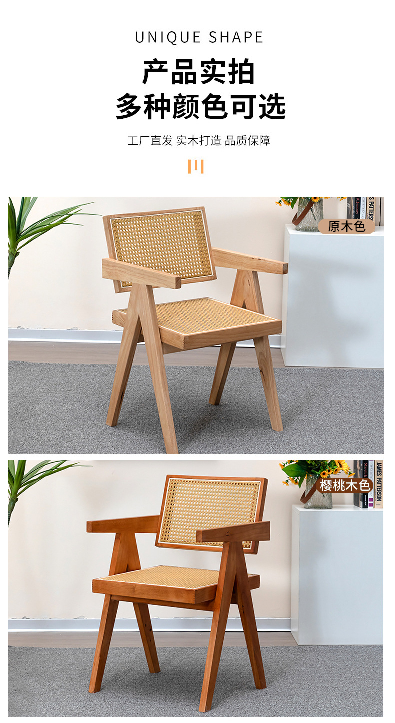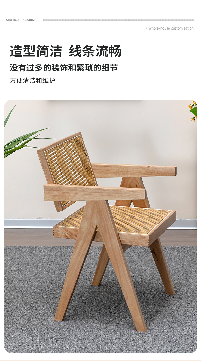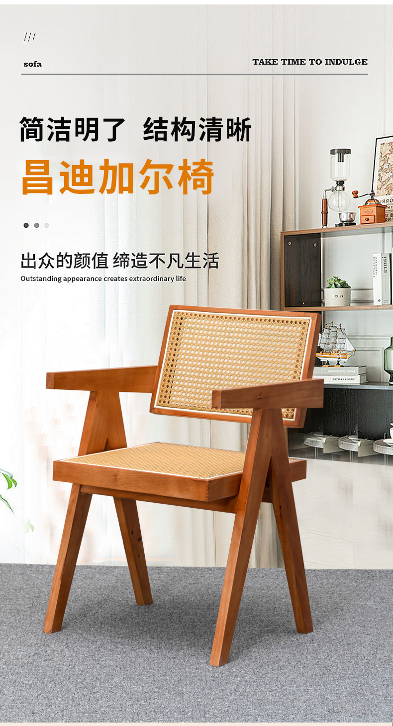 北欧家用实木单人椅昌迪加尔民宿阳台扶手休闲餐椅复古靠背藤编椅