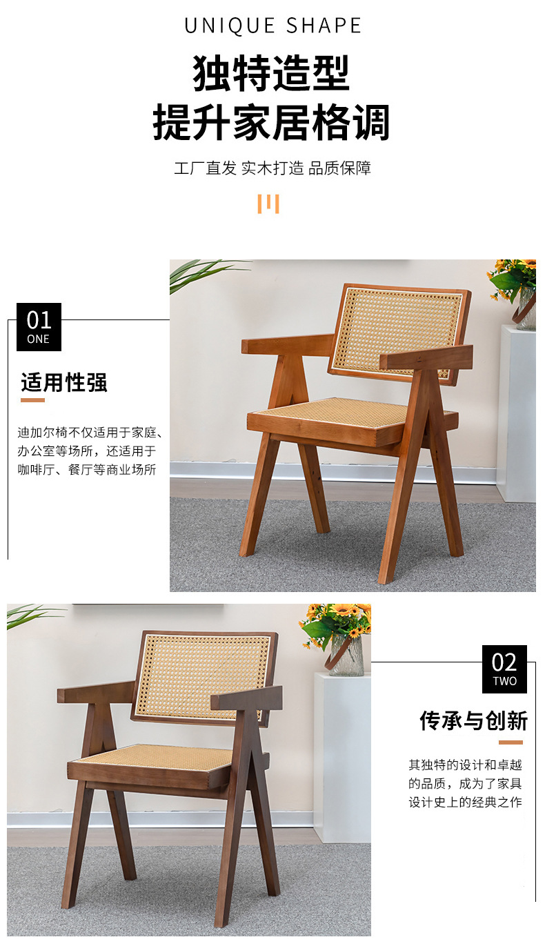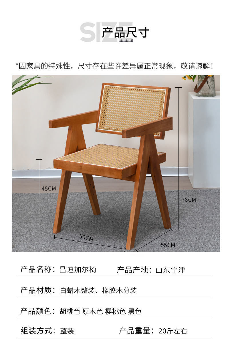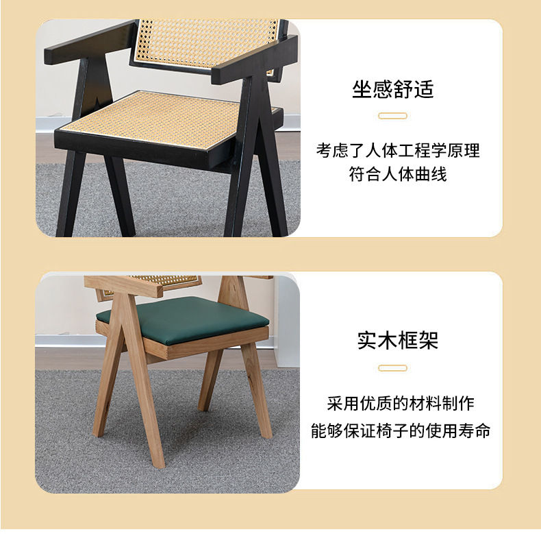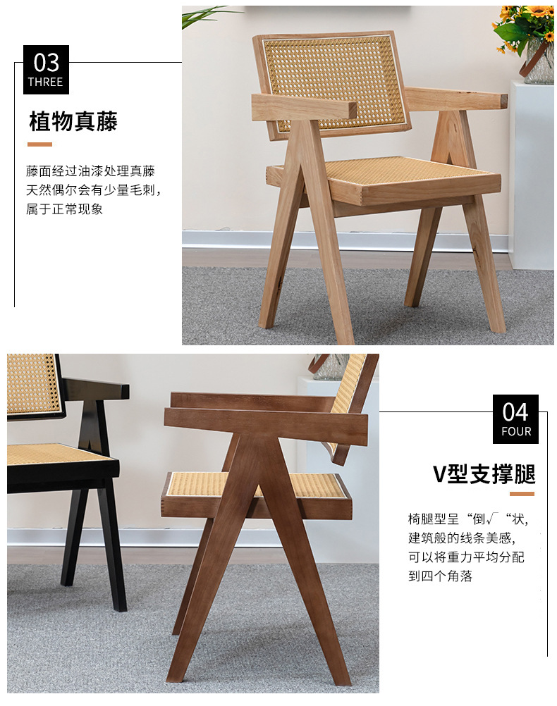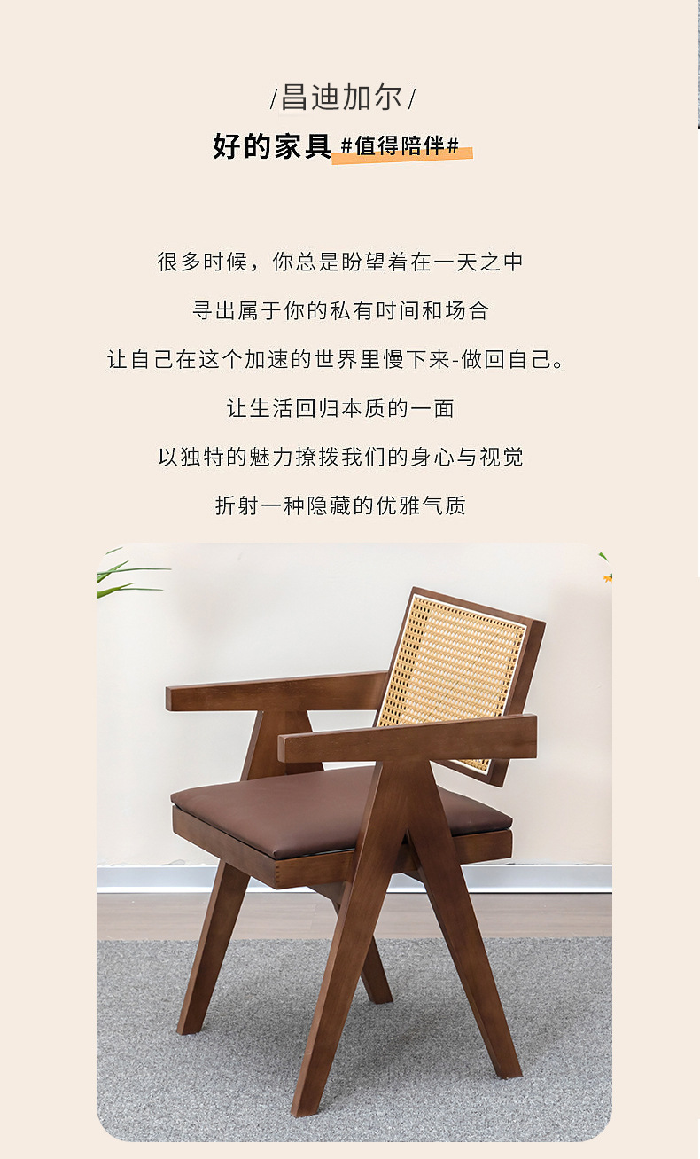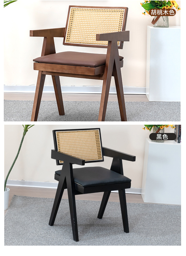 北欧家用实木单人椅昌迪加尔民宿阳台扶手休闲餐椅复古靠背藤编椅
