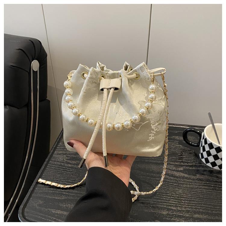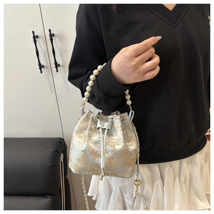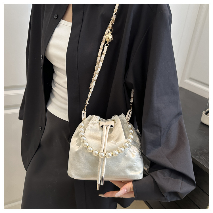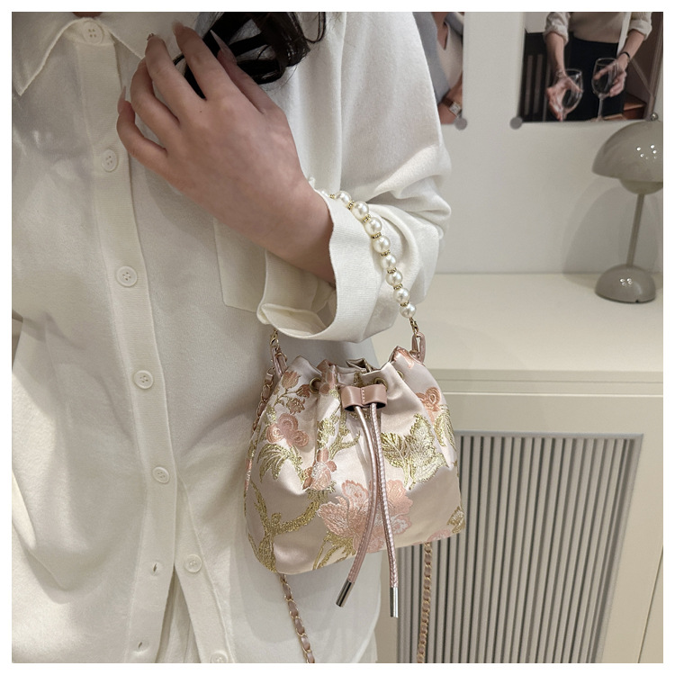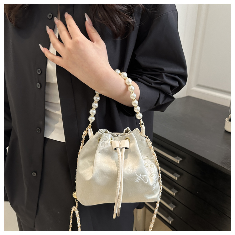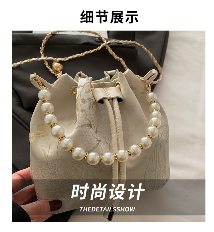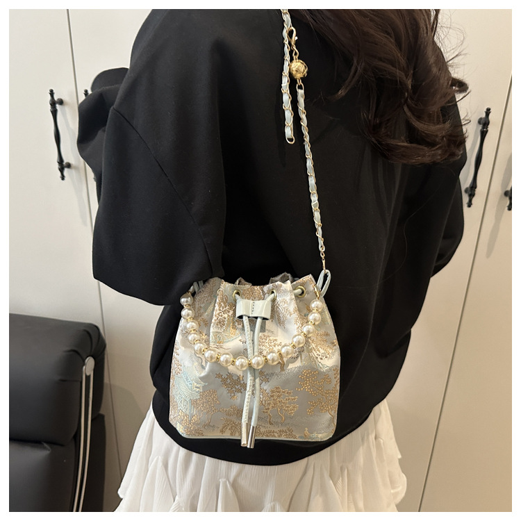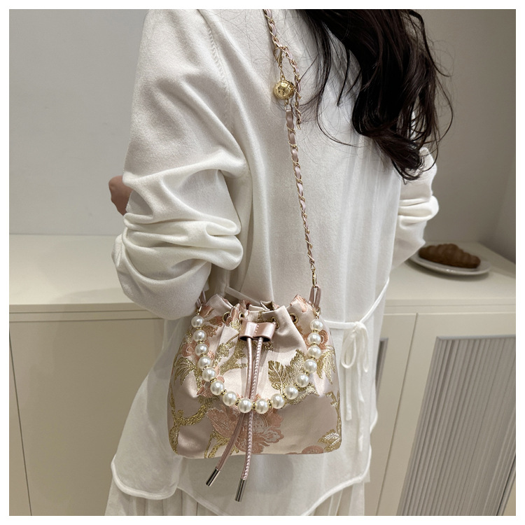 手拎珍珠链条水桶包女2025夏季新中式刺绣单肩包小众简约感斜挎包