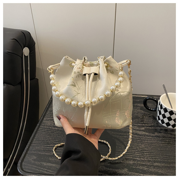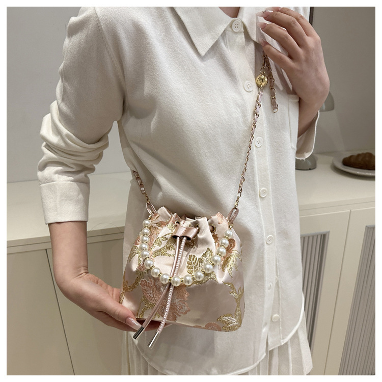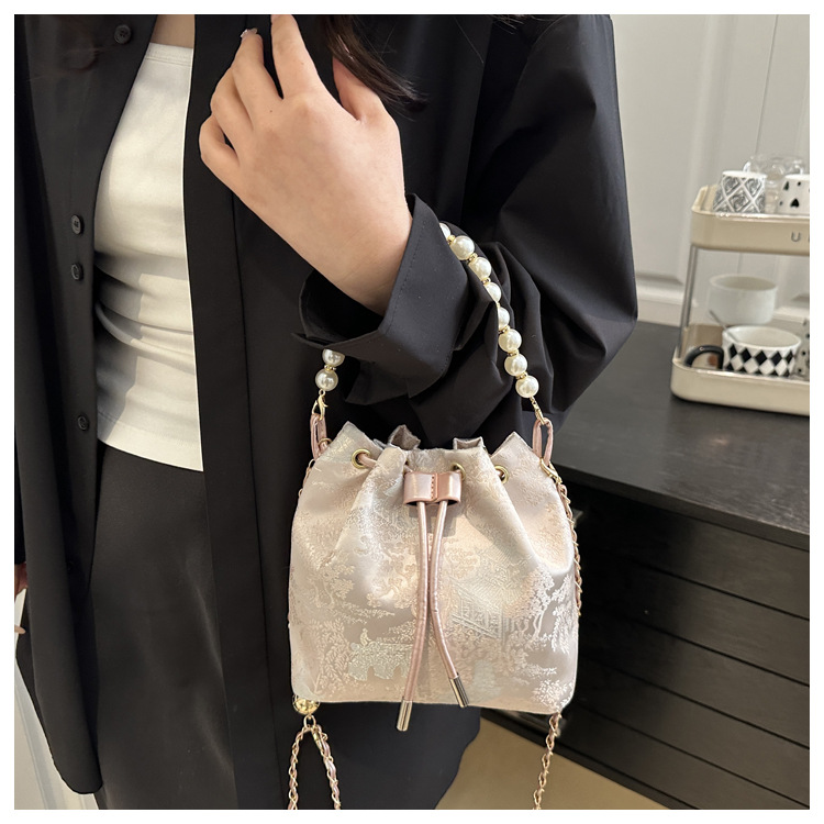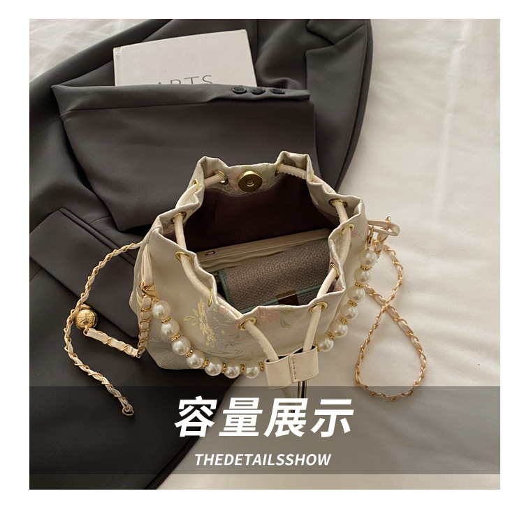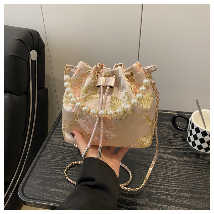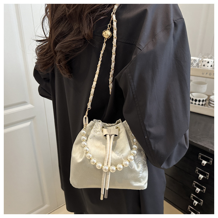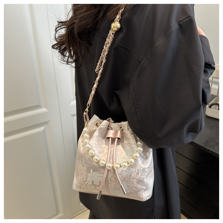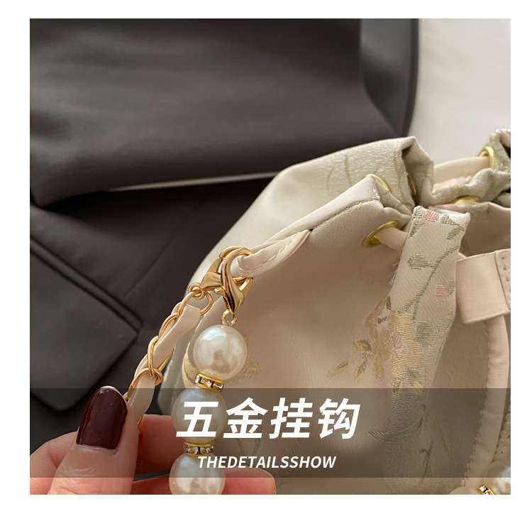 手拎珍珠链条水桶包女2025夏季新中式刺绣单肩包小众简约感斜挎包