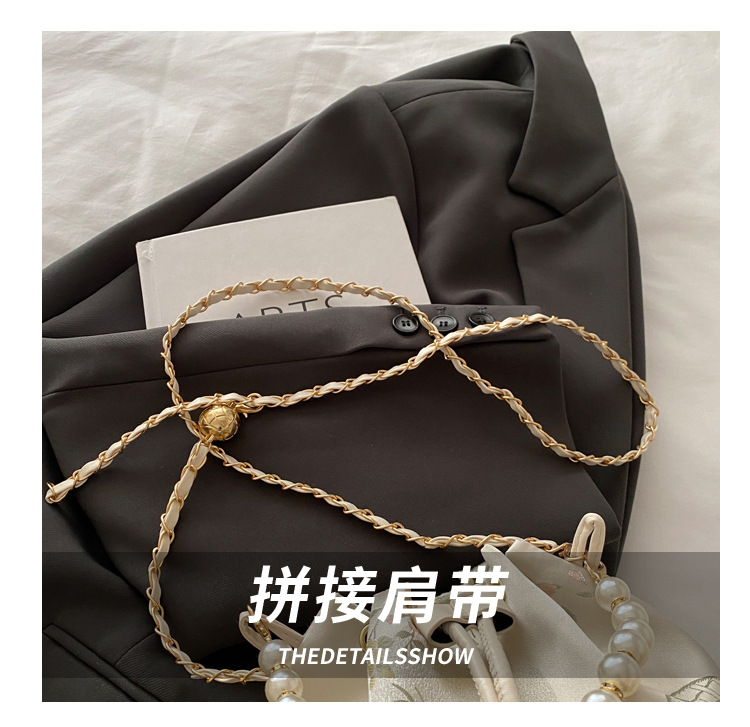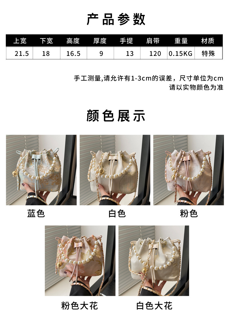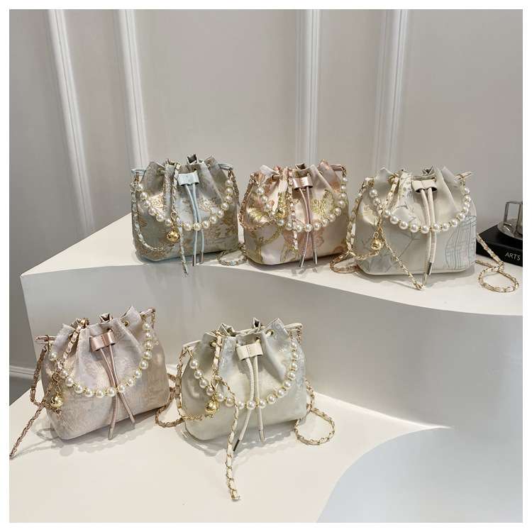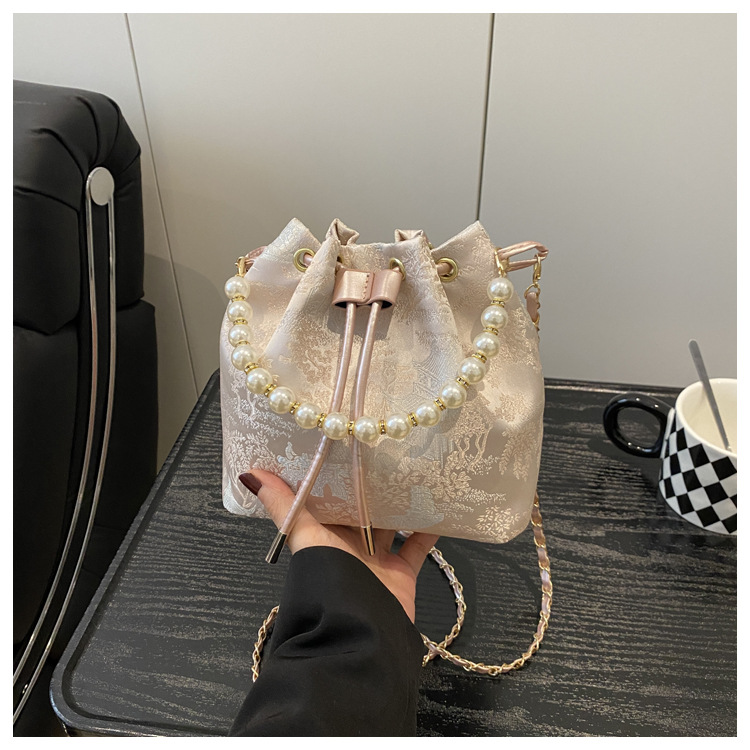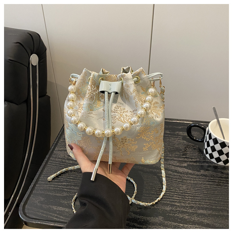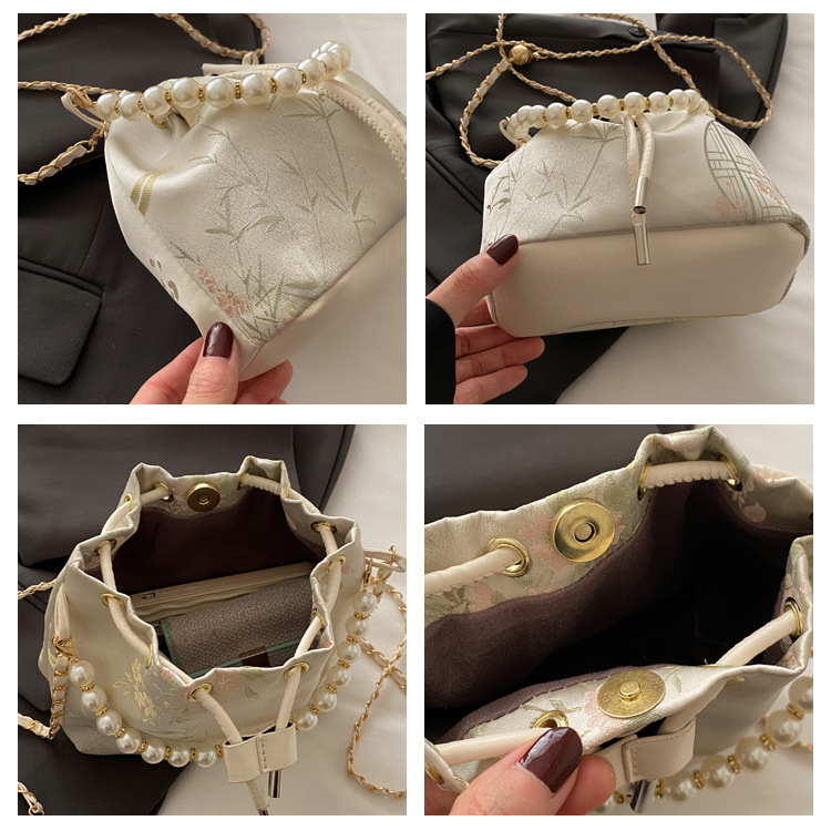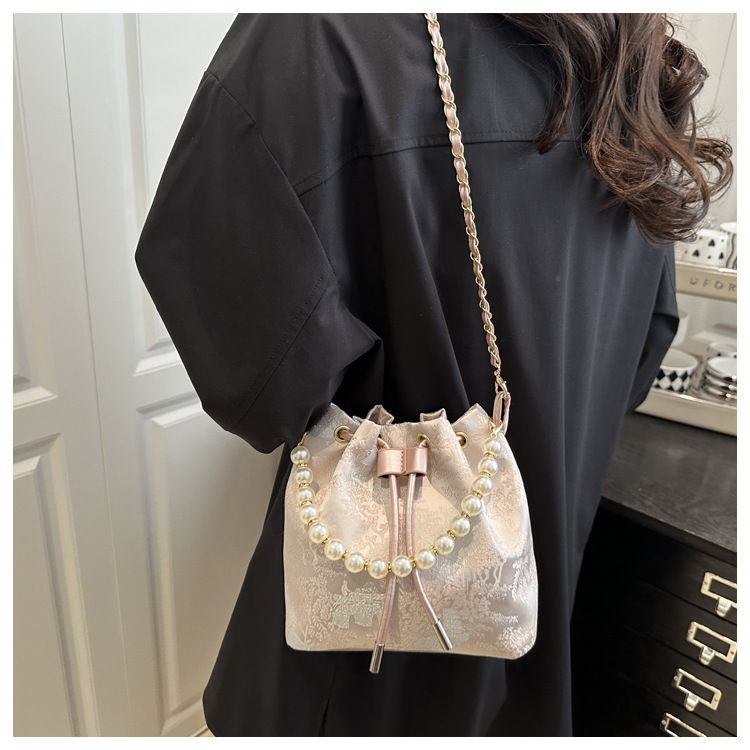 手拎珍珠链条水桶包女2025夏季新中式刺绣单肩包小众简约感斜挎包