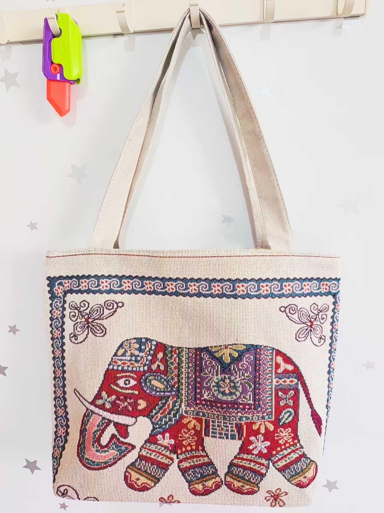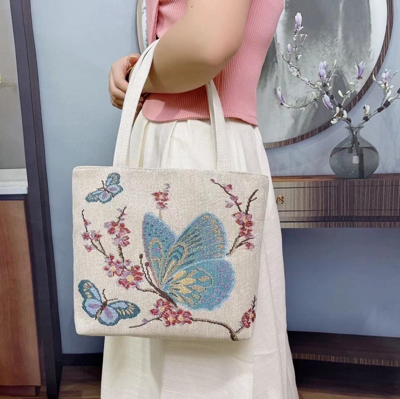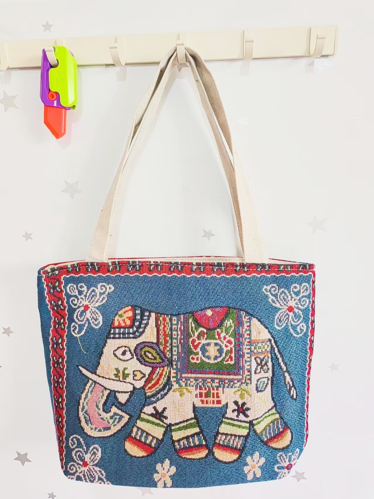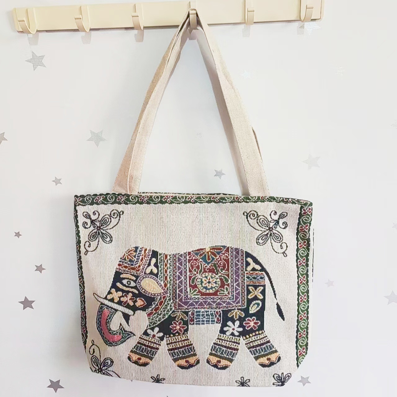 Tas bahu gaya etnik, tas kanvas sedang, dua sisi, sabuk hewan bordir, tas bahu sutra emas, tas perjalanan indah Thailand