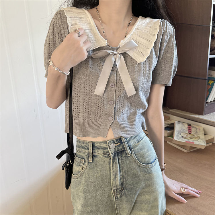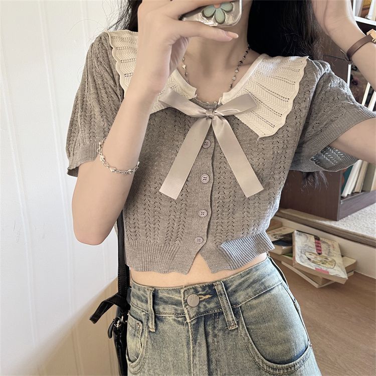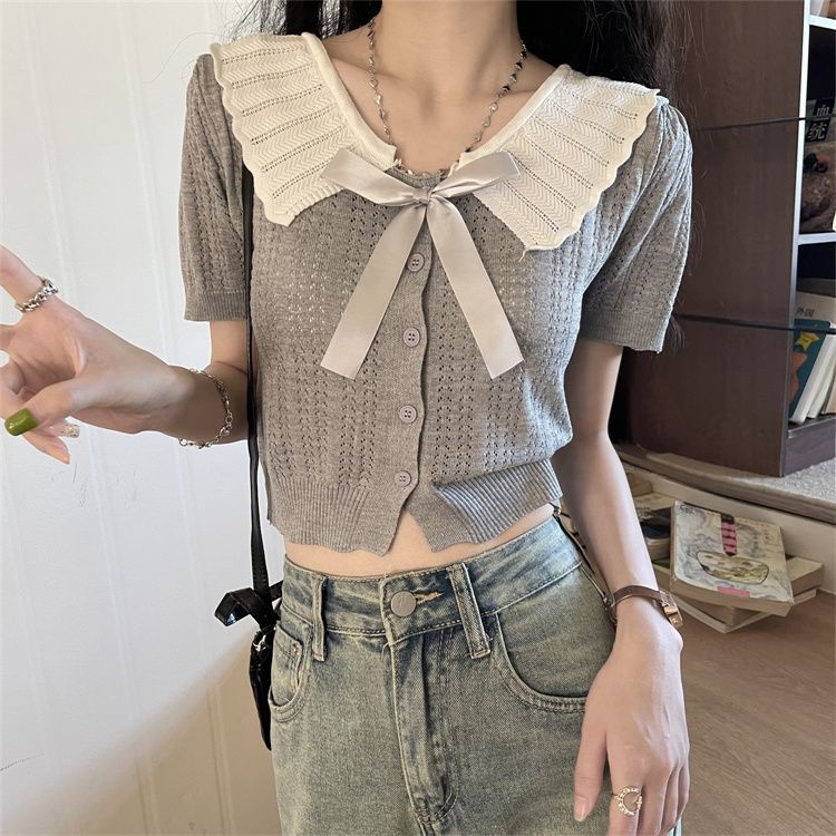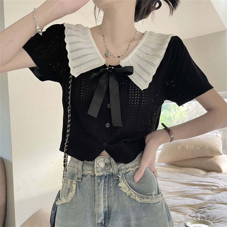 Kaus rajut lengan pendek kerah boneka, gaya lembut, Kaus rajut lengan pendek, desain hollow-out, atasan modis musim panas untuk wanita