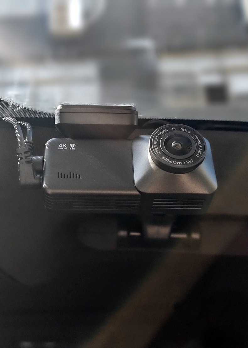 4K行车记录仪前后摄像头3840*2160+1920*1080P分辨率,5.8GHz WiFi、GPS,双车摄像头,1.5英寸IPS高清屏幕 行车记录仪,适用于汽车、,24小时停车模式,nightvision夜视功能,WDR HDR,170°广角,G传感器,循环录像、重力感应、碰撞锁定视频、视频录像语音录制、app应用控制finalcamx,最大支持512GB/ 1TB