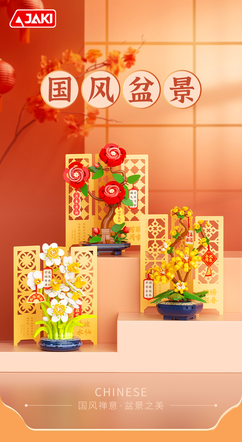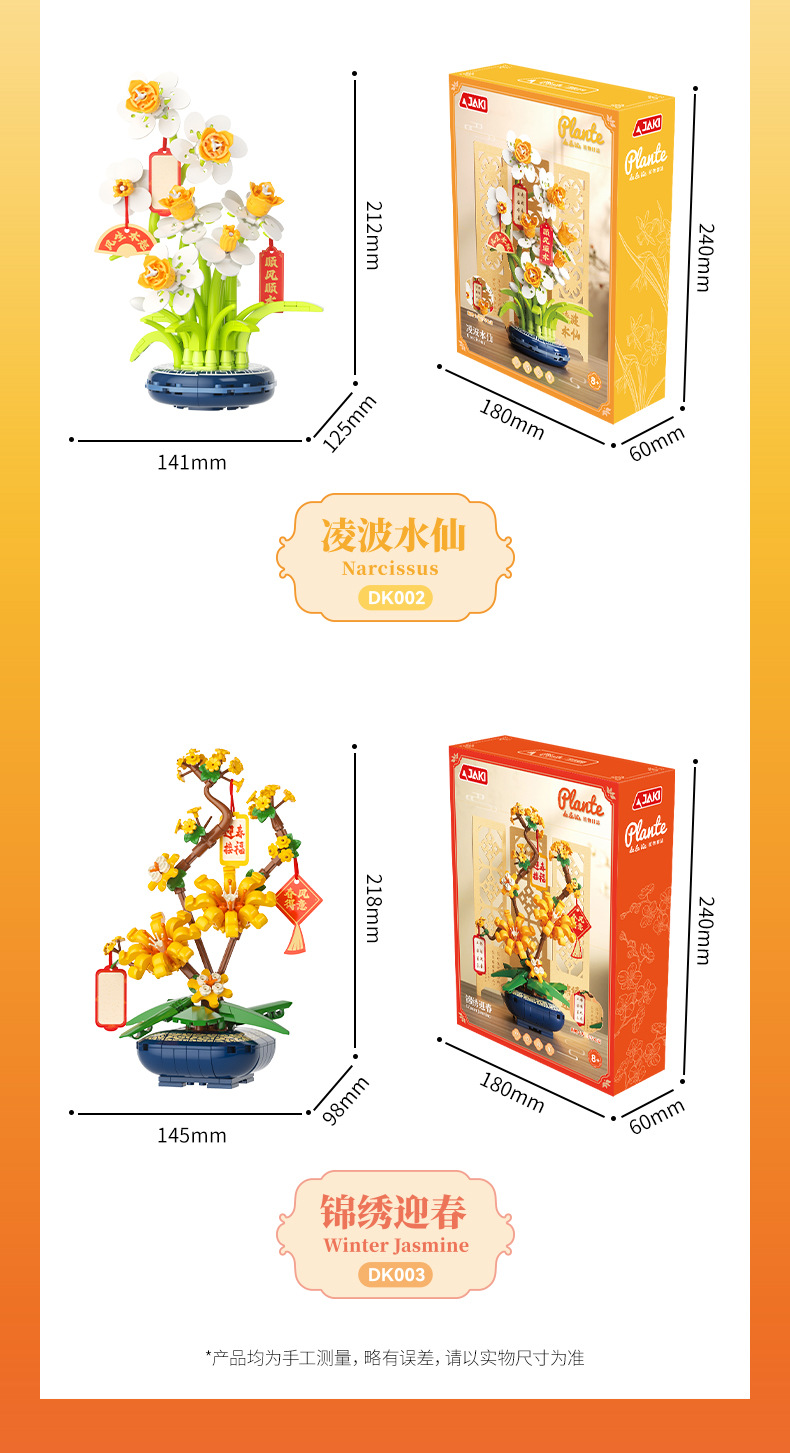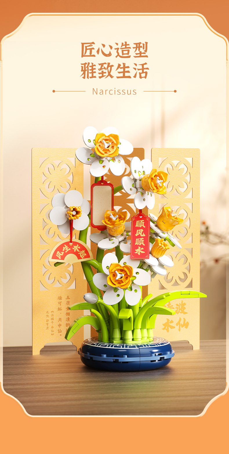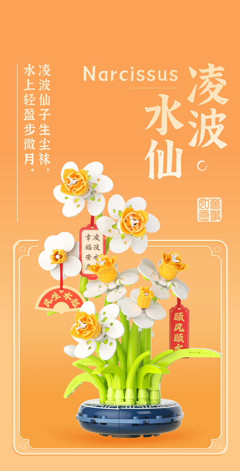 JAKI佳奇积木水仙花植物盆栽永生花国风摆件模型送女友情人节礼物