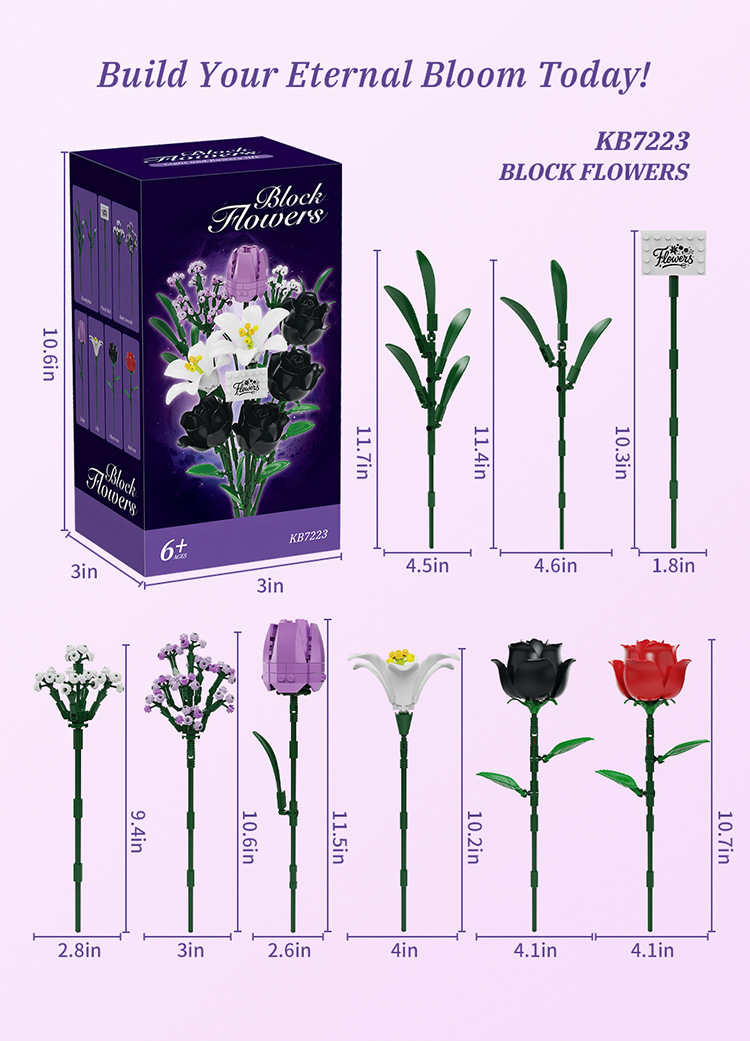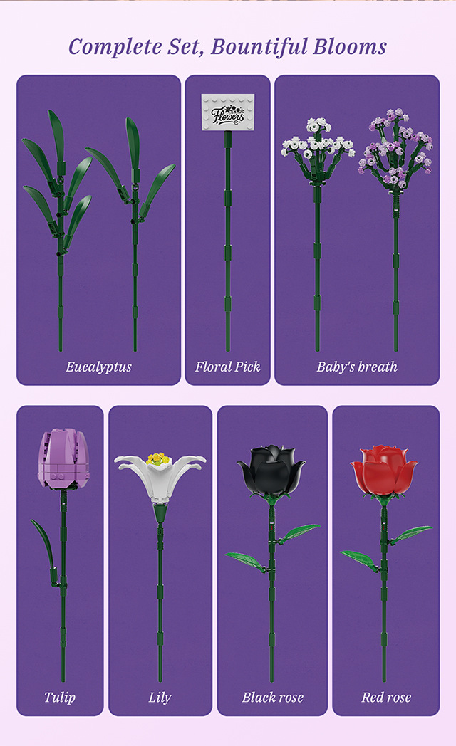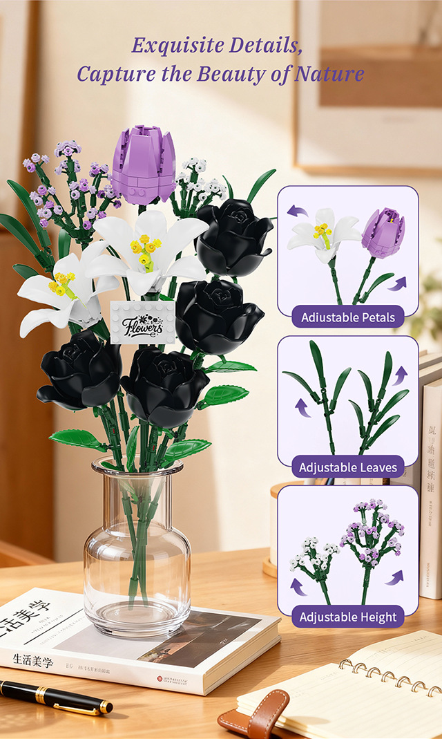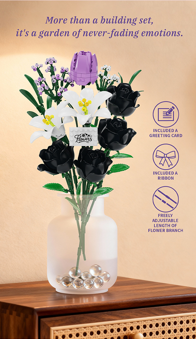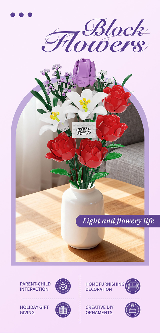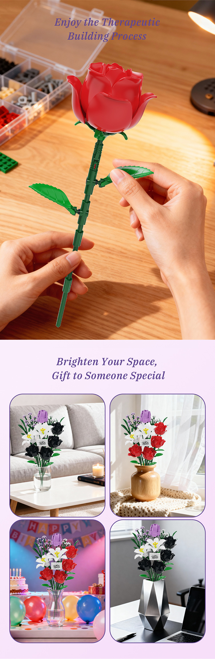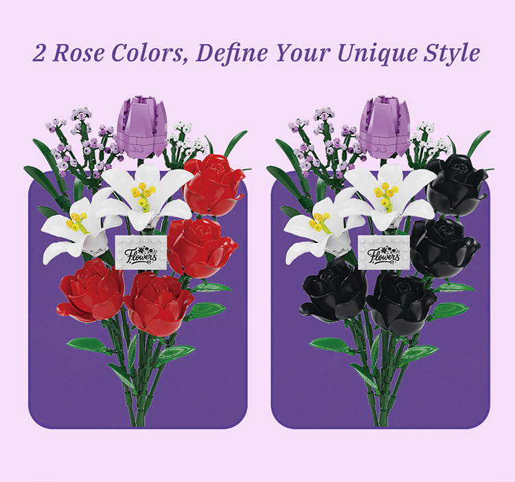 砖圆积木花永生玫瑰大颗粒拼装花束玩具礼物跨境仿真积木花束摆件