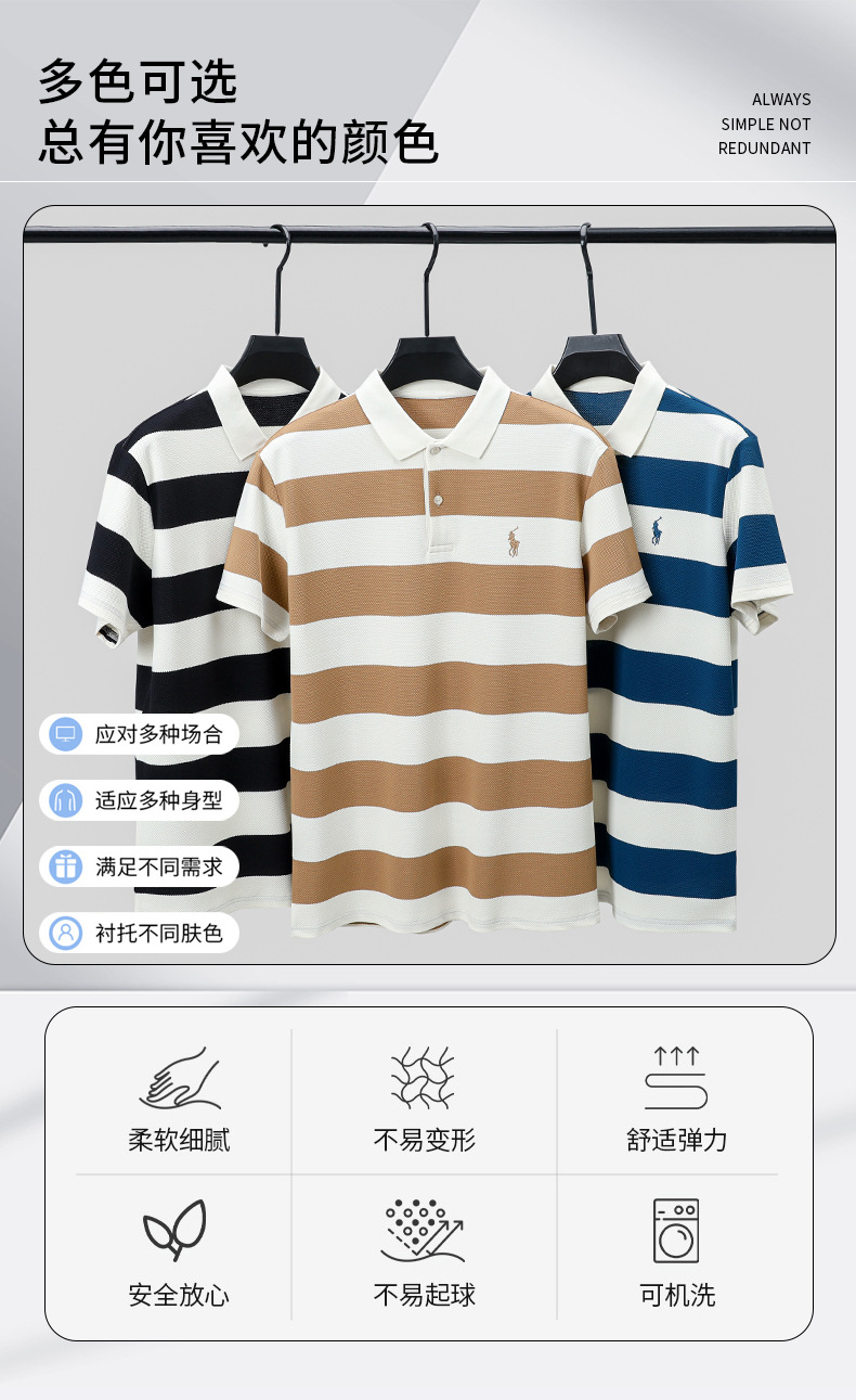 男士短袖T恤2025夏季冰丝超薄速干纯色暗条纹中年休闲POLO衫上衣