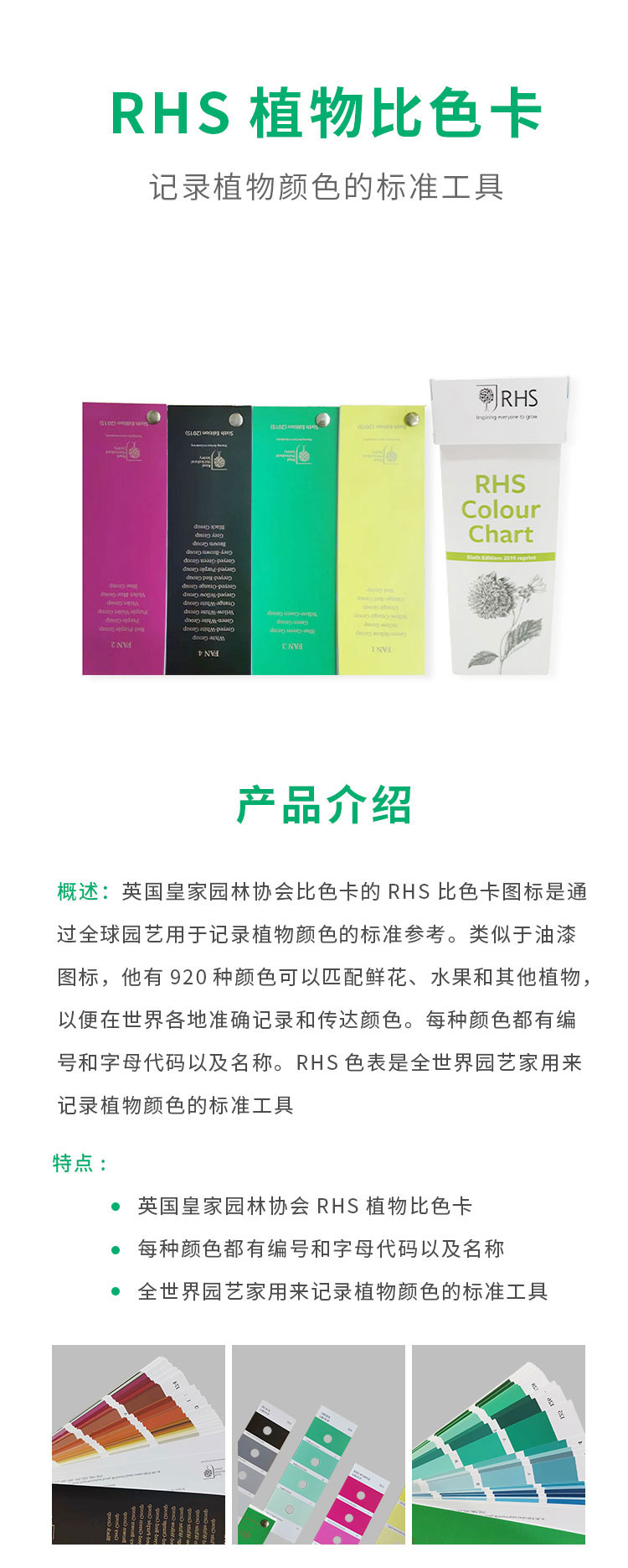 RHS标准比色卡是植物颜色鉴定的参考标准。该比色卡对于重视区分植物颜色的园艺工作者来说是的。不仅仅是重视颜色的园艺工作者,该比色卡对于食品制造商、化学工程公司和面料设计师也都有很大的作用,因为它逐渐发展成了符合自然本身颜色的比色卡,成为了一个非常有用的工具。920种颜色分布在224张卡上,组成了1套4个易学易用的扇形,每个色标都有一个舷窗,在对比颜色时,可以放在下面。比色卡表面的光滑涂层增强了其抗划痕性,该比色卡还提供了六种语言(英语、法语、荷兰语、法语、俄语及日语)的使用说明。