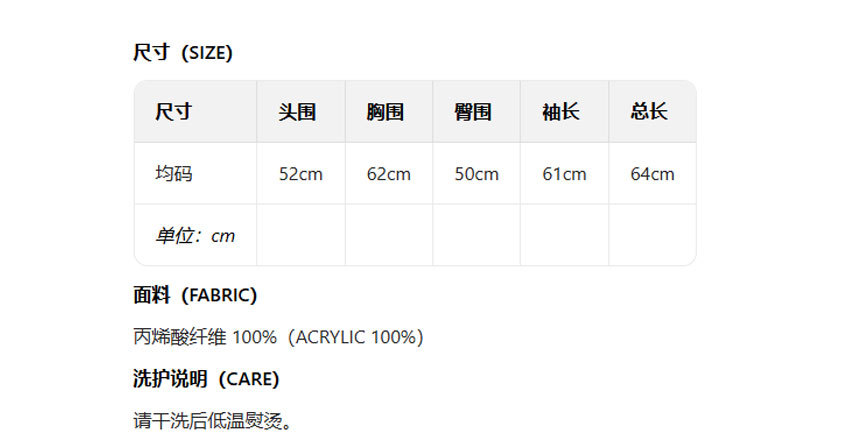 关于尺寸:由于毛衣面料的不同会导致1-5cm的误差,