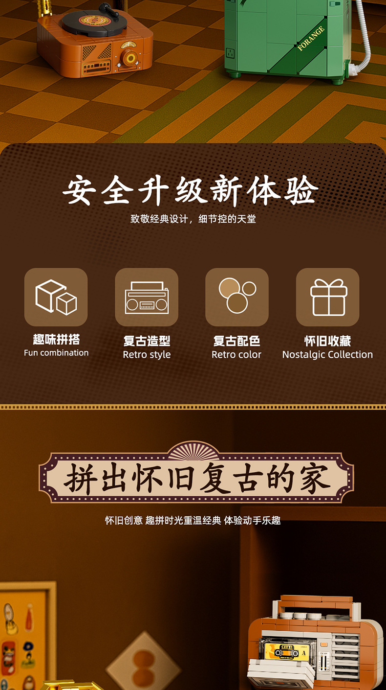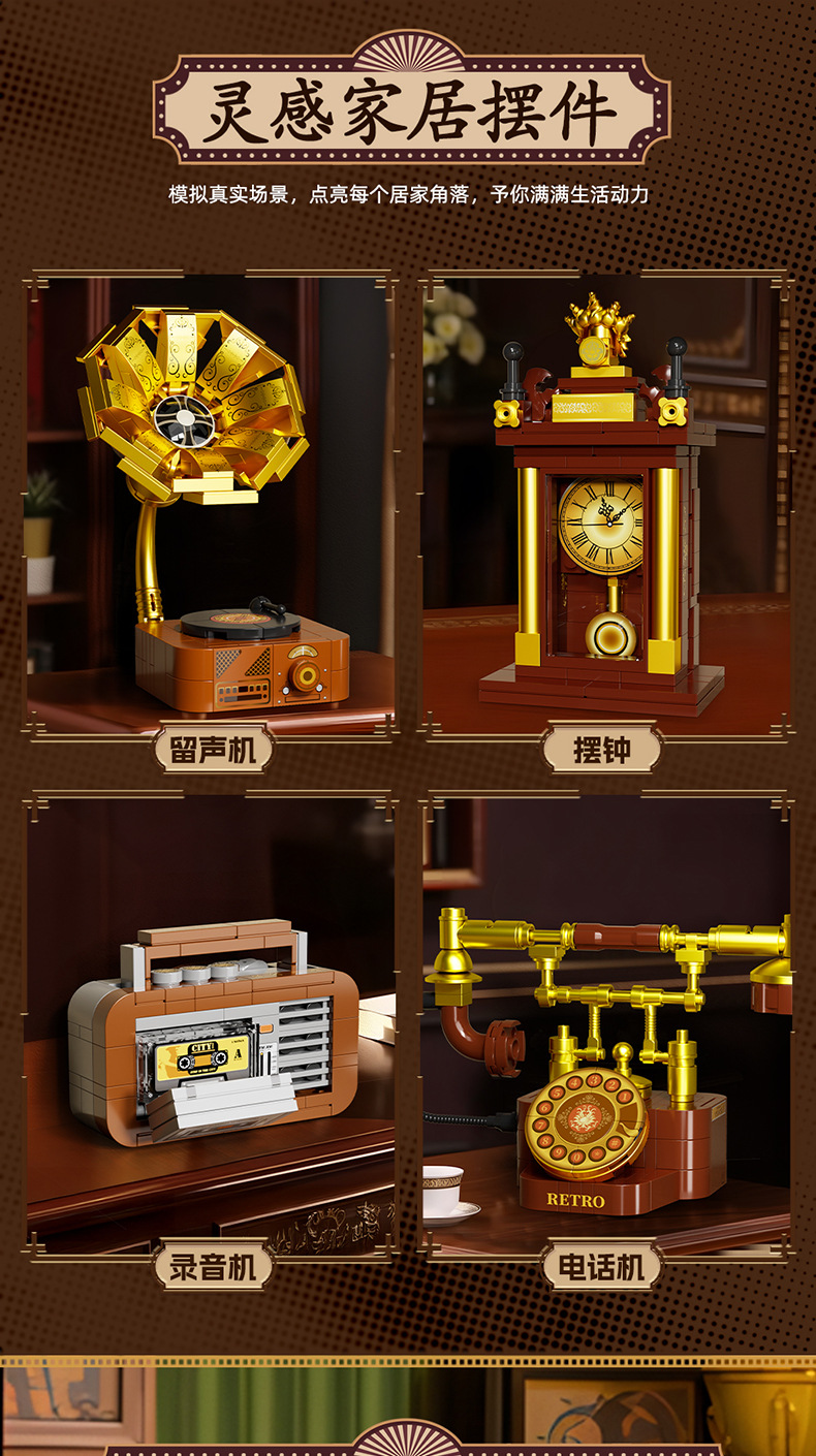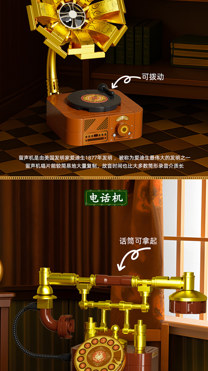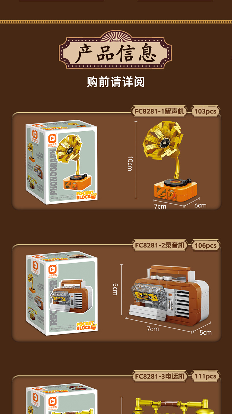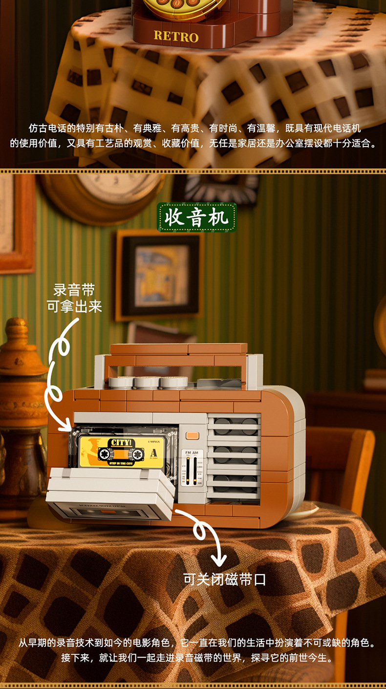 Peron Oranye Simulasikan Retro Perekam Mini Model Telepon Gramofon Teka-teki Rakitan Partikel Kecil Blok Bangunan Mainan
