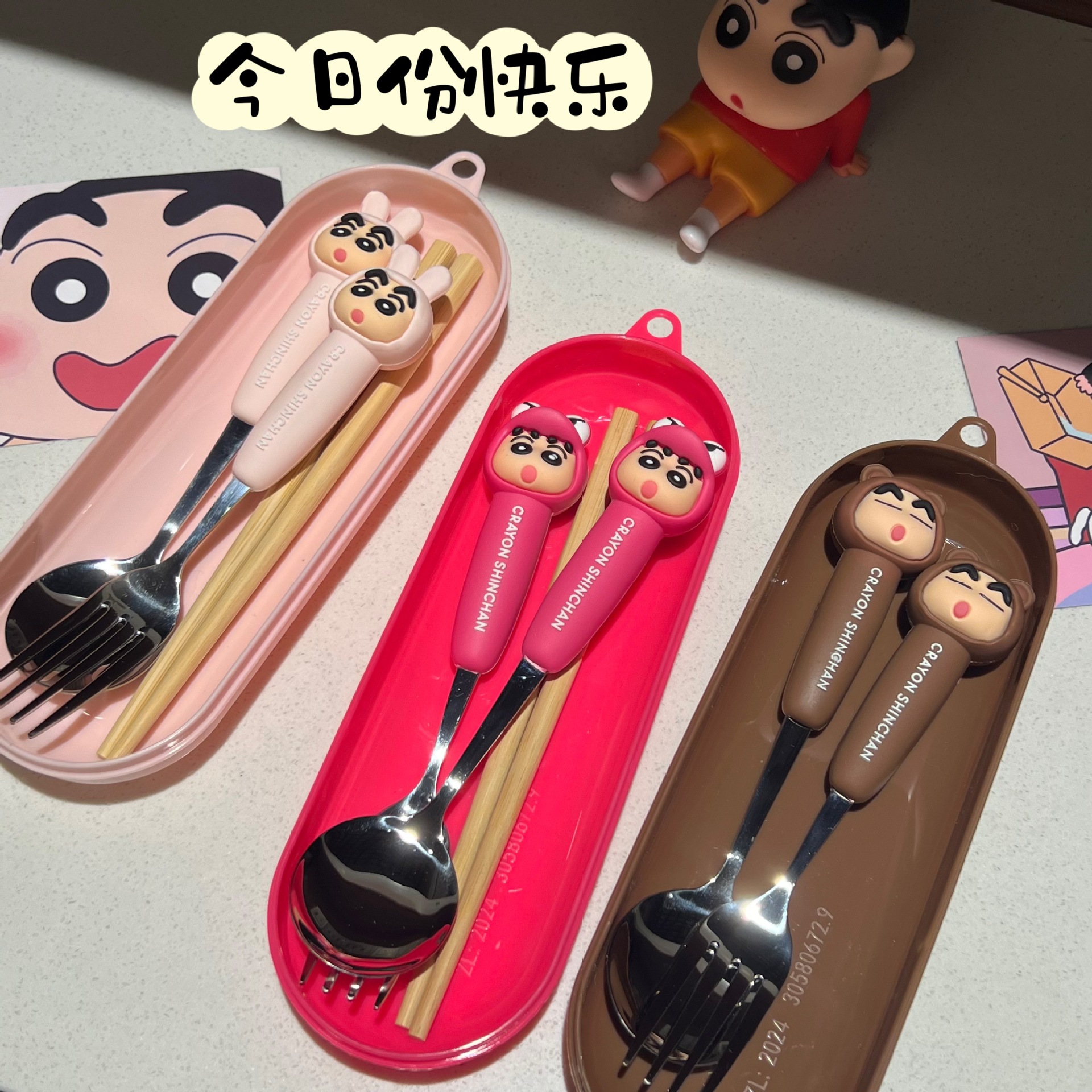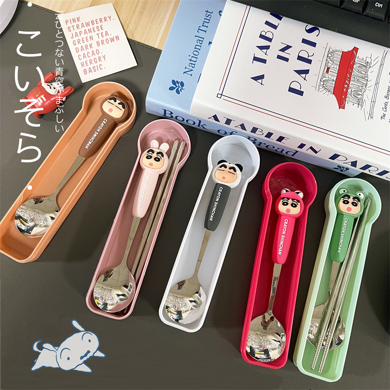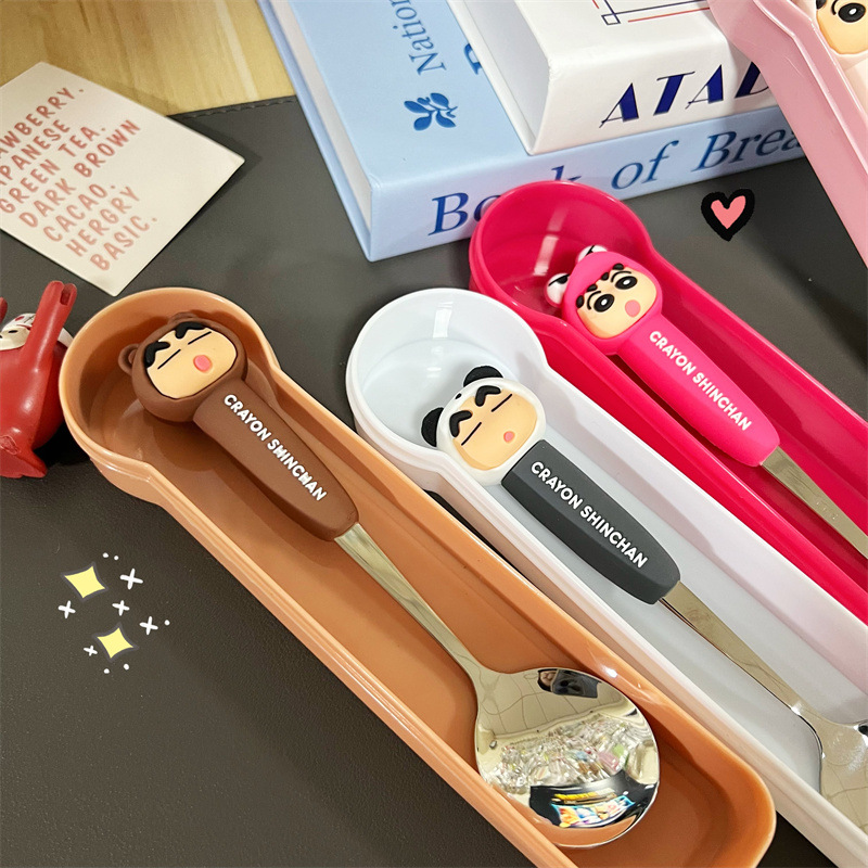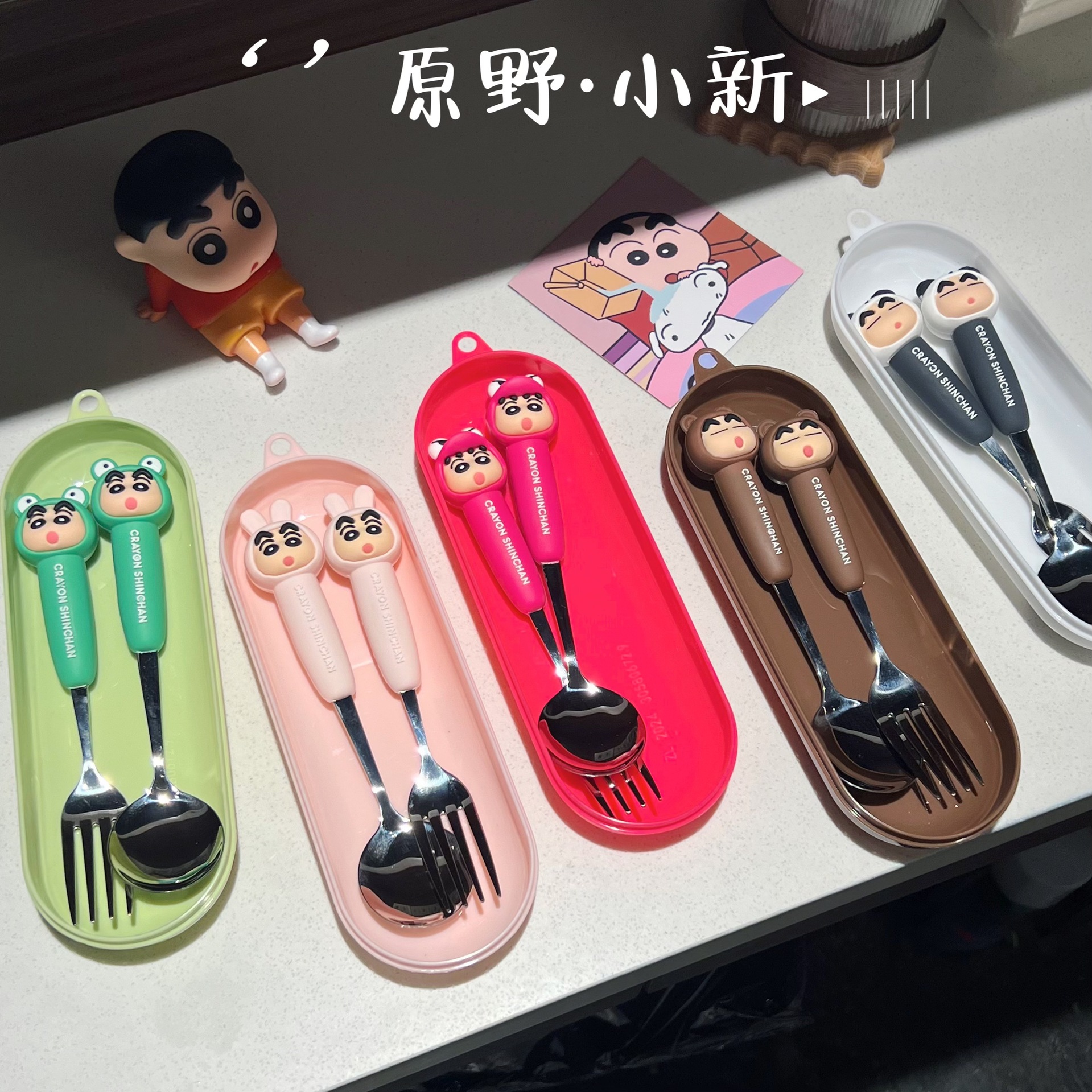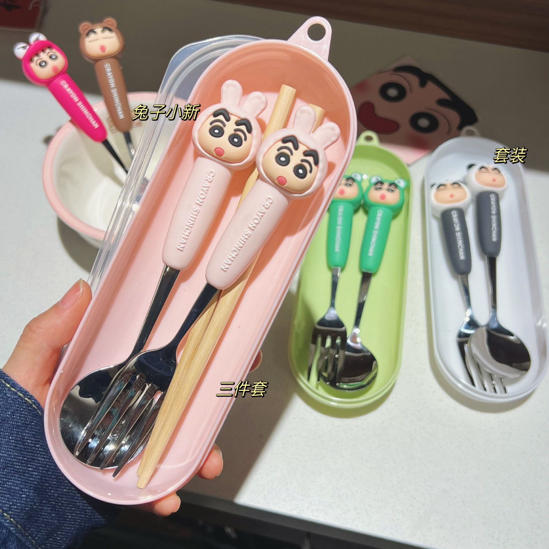 Crayon Kecil Portabel Stainless Steel Anti Banting Sendok Kotak Makan Sendok Sumpit Set Tiga Potong Garpu Kartun Siswa Sendok Minum Sup