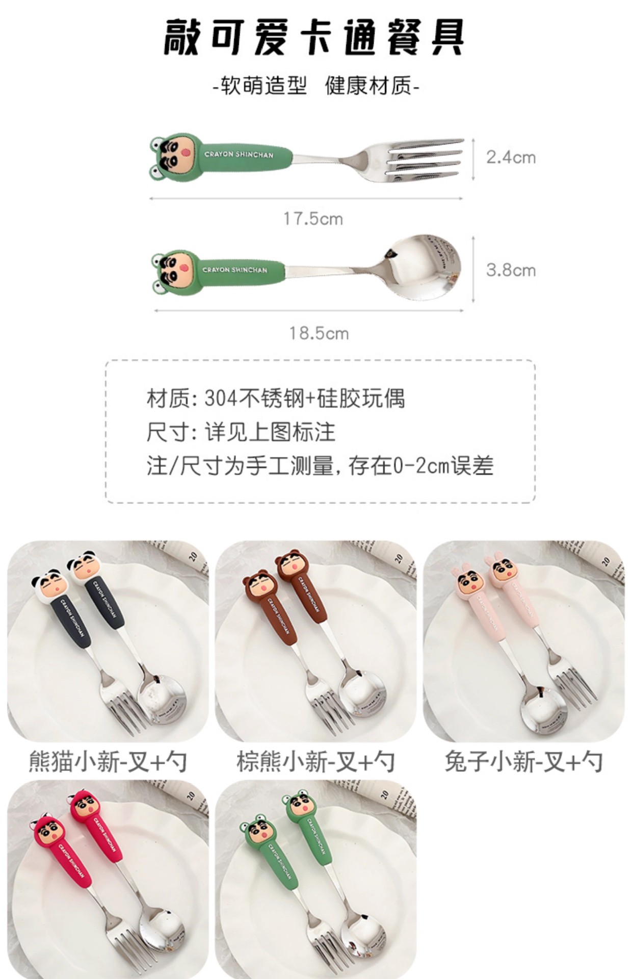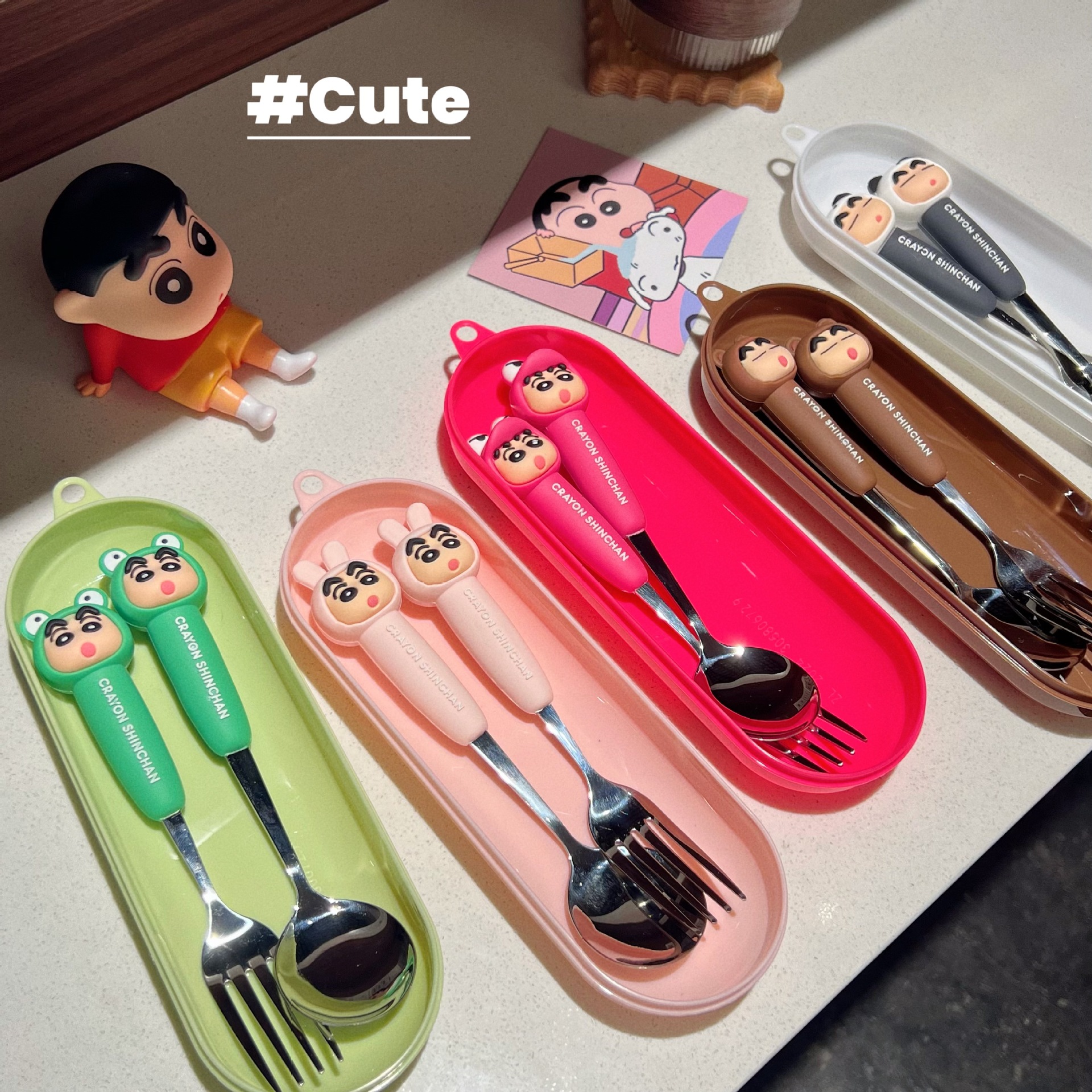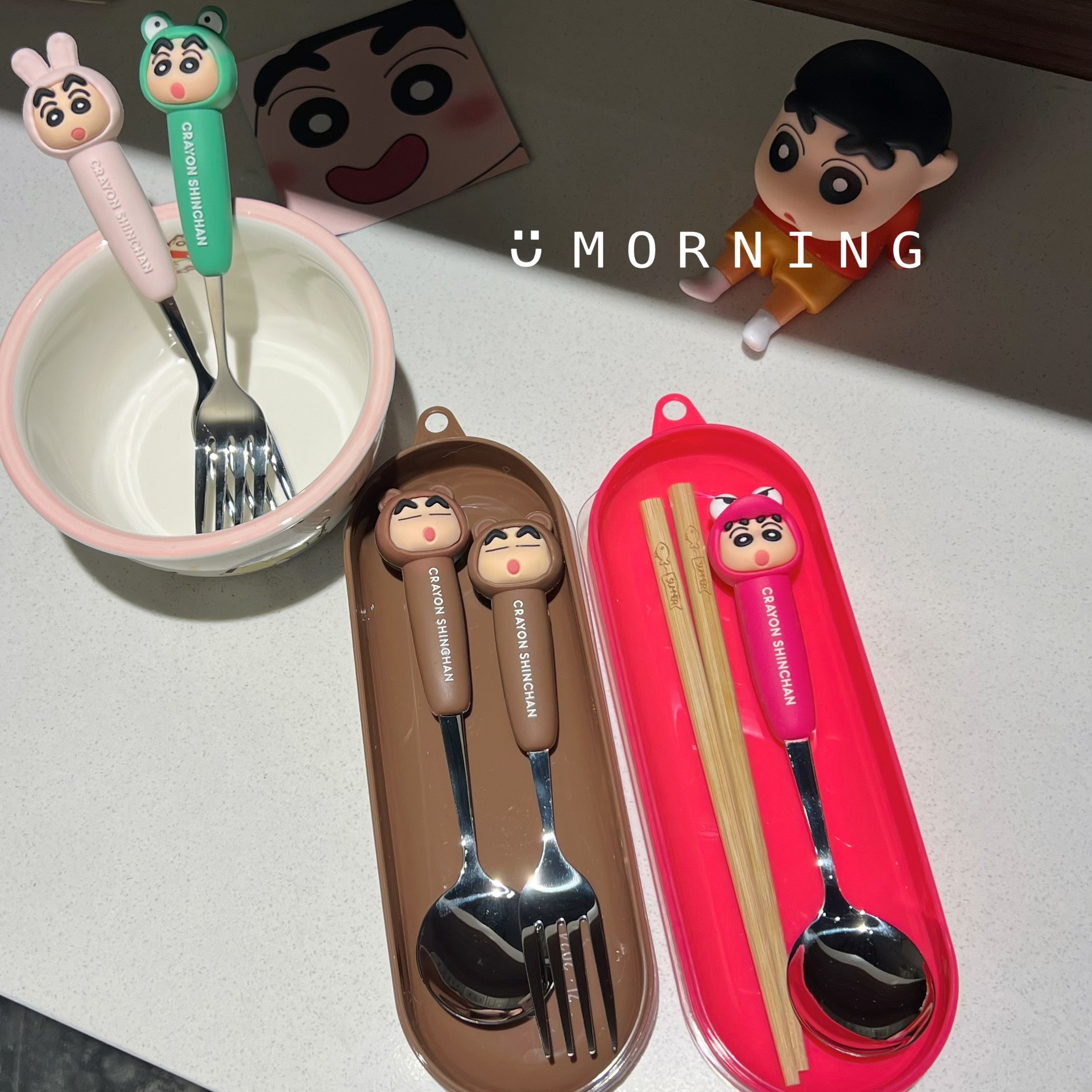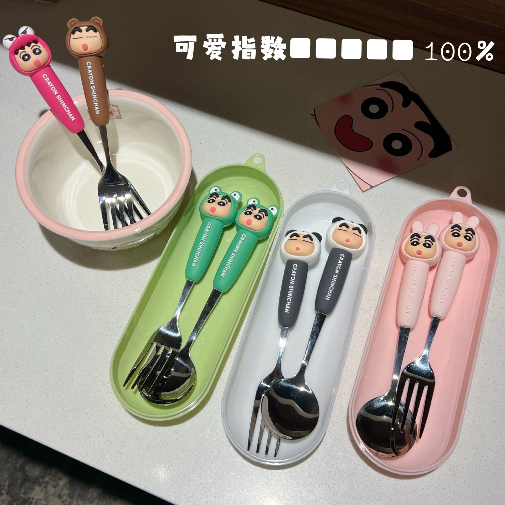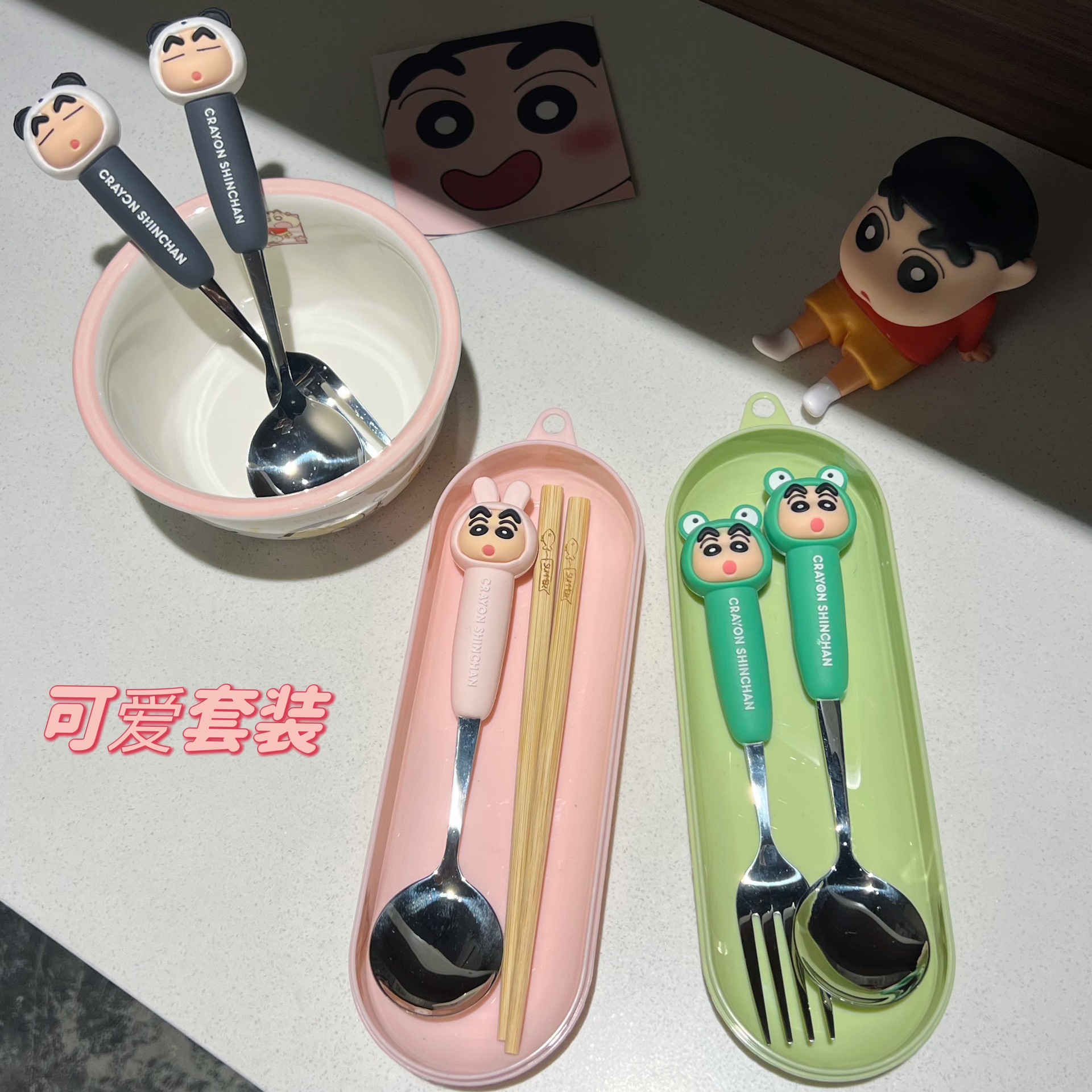 Crayon Kecil Portabel Stainless Steel Anti Banting Sendok Kotak Makan Sendok Sumpit Set Tiga Potong Garpu Kartun Siswa Sendok Minum Sup