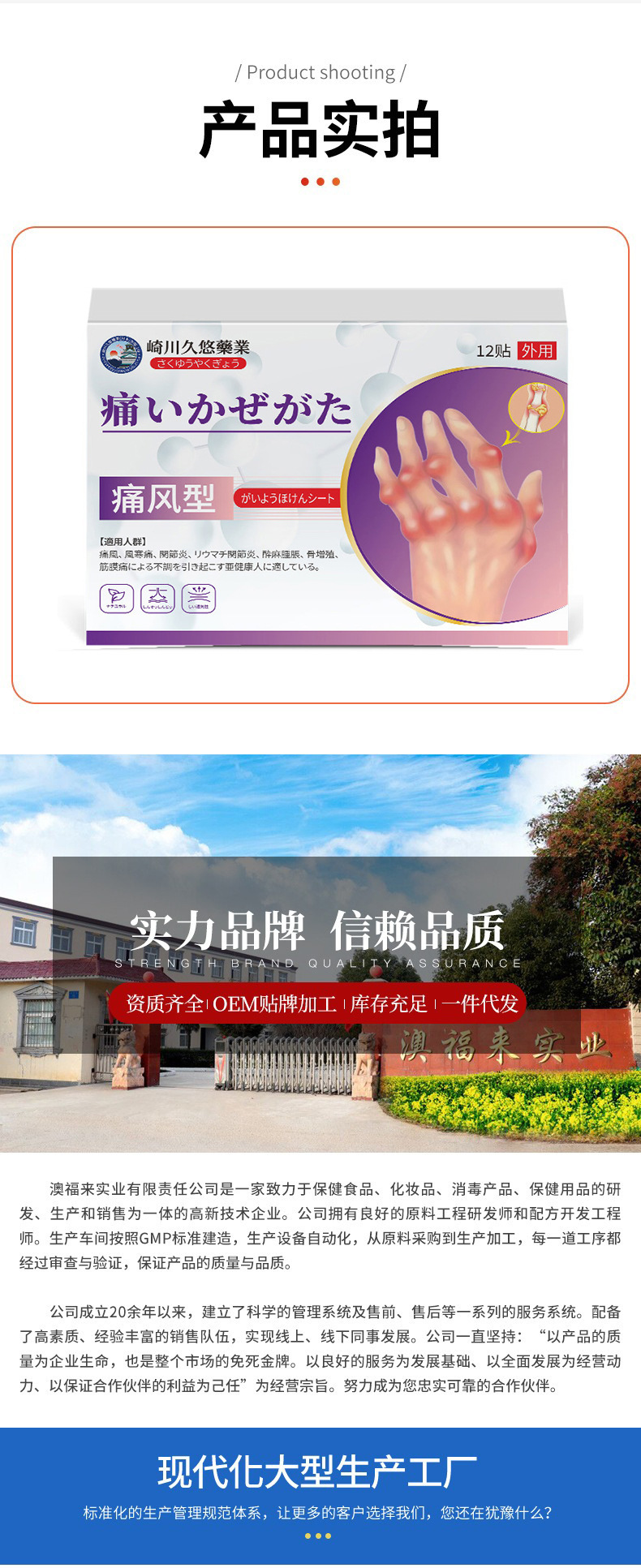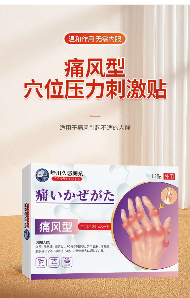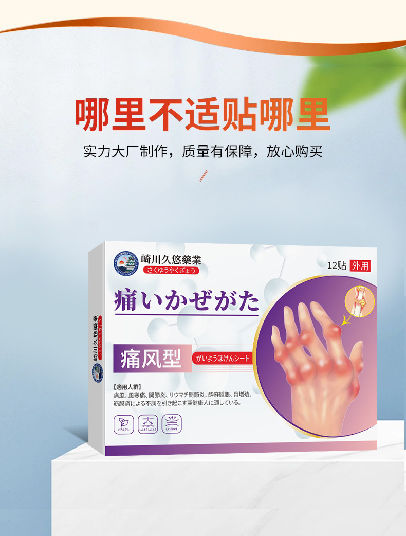 Sakikawa Kyuyou Gout-Type Patch 12 plester untuk meredakan dan merawat ketidaknyamanan sendi, nyeri sendi jari, kemerahan, dan bengkak untuk penggunaan luar.