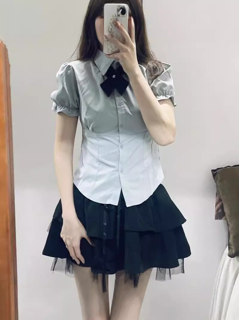 Atasan Terlihat Kurus Ramping Ramping Membentuk Tubuh Lipatan Niche Gaya Desain Gaya Barat Modis Musim Panas Wanita Kemeja Pelangsing Lengan Busa Manis Gadis Pedas Manis