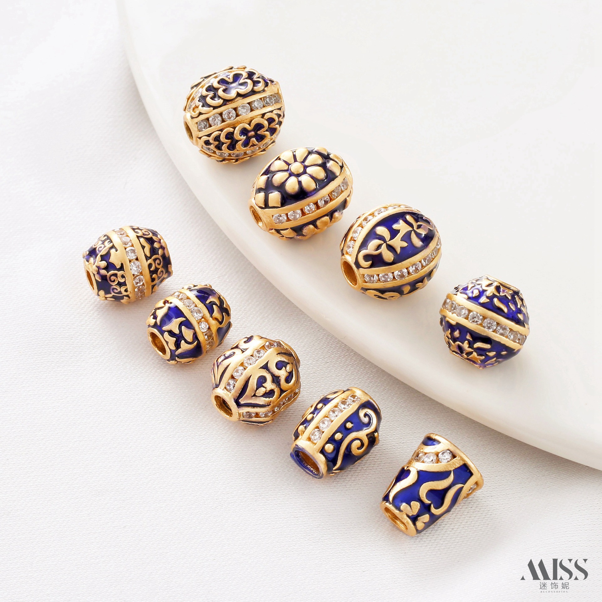 18K warna dibalut emas aksesori perhiasan gelang tali kalung diy manik-manik spacer pola porselen biru dan putih glasir biru tertanam berlian emas matte kuno