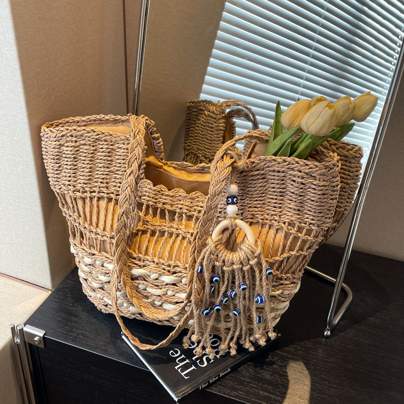 Tas jinjing anyaman wanita, kapasitas besar musim panas baru 2024, tas tote liburan pantai Satu bahu serbaguna
