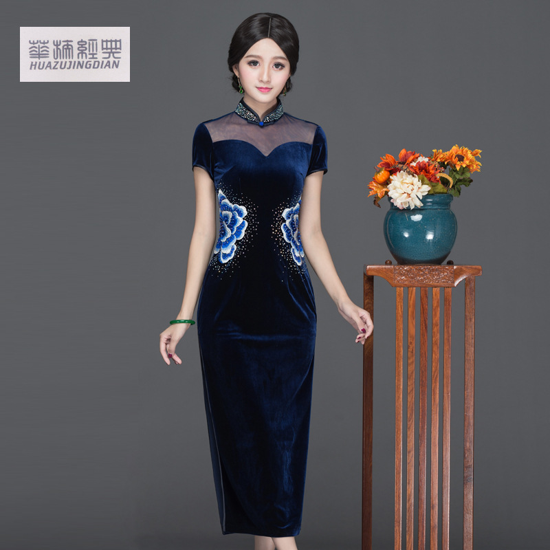 Pakaian Musim Panas Klasik Tiongkok Rok Cheongsam Beludru Emas Bordir Improved Model Baru Gaun Tinggi Pernikahan Wanita Grosir