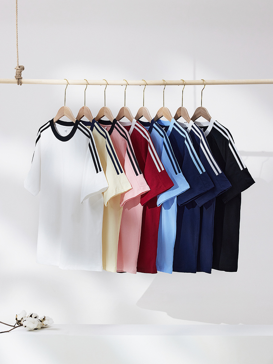 Kaus lengan pendek pria, 250g katun murni, tiga batang, retro Amerika, kerah berat, lengan pendek, pasangan, warna solid, kasual, semua cocok
