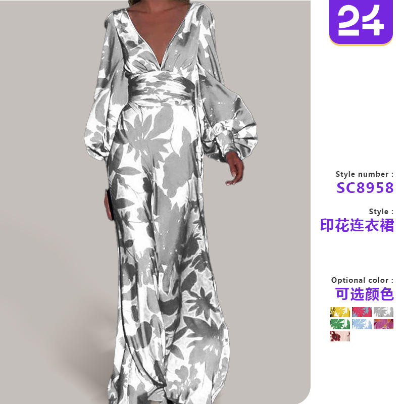Gaun Pakaian Wanita Eropa dan Amerika Lintas Batas Amazon Model Baru 2025 Rok Panjang Kerah V Bercorak Modis Lengan Lentera Membentuk Tubuh
