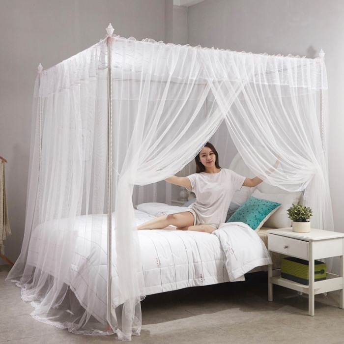 Kelambu tradisional bergaya istana dengan atap persegi untuk penggunaan di rumah, ukuran tempat tidur ganda 1,5m, dudukan baja tahan karat 1,8m, kelambu putri musim panas model berdiri di lantai.