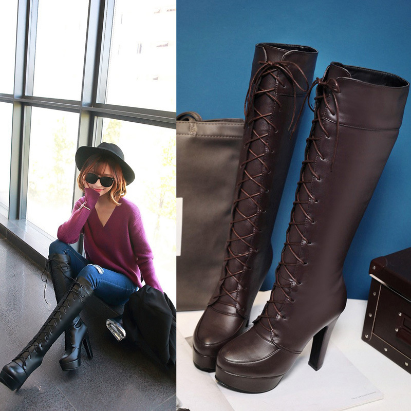 Sepatu bot Romawi renda silang Retro, sepatu bot tinggi musim gugur musim dingin, sepatu bot hak tinggi tebal, sepatu bot perdagangan luar negeri ukuran 40-43