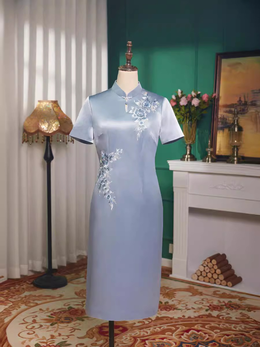 Gaun pengantin wanita musim gugur kelas atas gaya Cina cheongsam modifikasi biru untuk ibu mertua, pakaian ibu untuk jamuan pernikahan dan toast.
