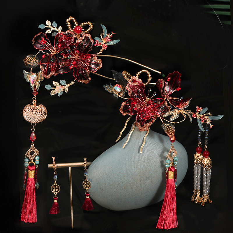 Xiuhe hiasan kepala pengantin aksesoris rambut 2024 baru gaya Cina manufaktur sederhana bunga merah Xiuhe pakaian pernikahan aksesoris