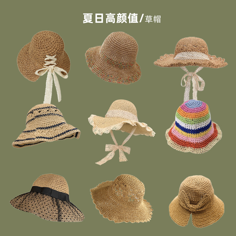 Topi jerami wanita renda pita berongga, topi rajut musim panas pelindung matahari mode dapat dilipat
