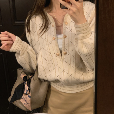 Atasan rajutan model Hong Kong dengan kerah desainer, potongan pendek, dan pinggang ramping untuk wanita, cocok untuk awal musim gugur.