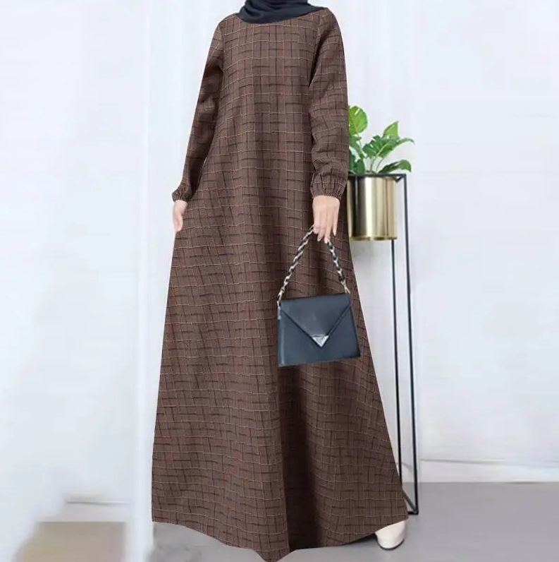 Baju Wanita Muslim lengan panjang, baju katun linen vintage Lengan Panjang kotak-kotak leher bulat kasual longgar musim gugur 2024