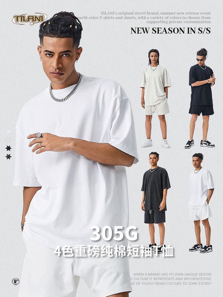 Pakaian Pria TILANI Kaus Lengan Pendek Katun Tulen Berat 305G Model Baru Musim Panas 2025 T-shirt Pria Ukuran Besar Longgar Model Dasar